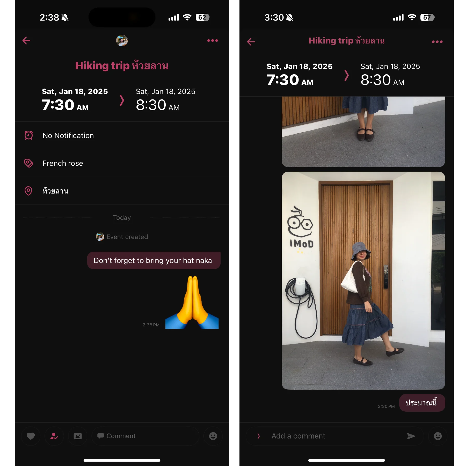 แอป TimeTree มีฟีเจอร์แชทภายในกิจกรรมที่คุณสร้าง โดยแยกแต่ละกิจกรรมให้เลย ทำให้คุณสามารถสนทนาและแลกเปลี่ยนความคิดเห็นเกี่ยวกับกิจกรรมต่าง ๆ ได้โดยตรงในแอป ไม่ต้องสลับไปยังแอปอื่น