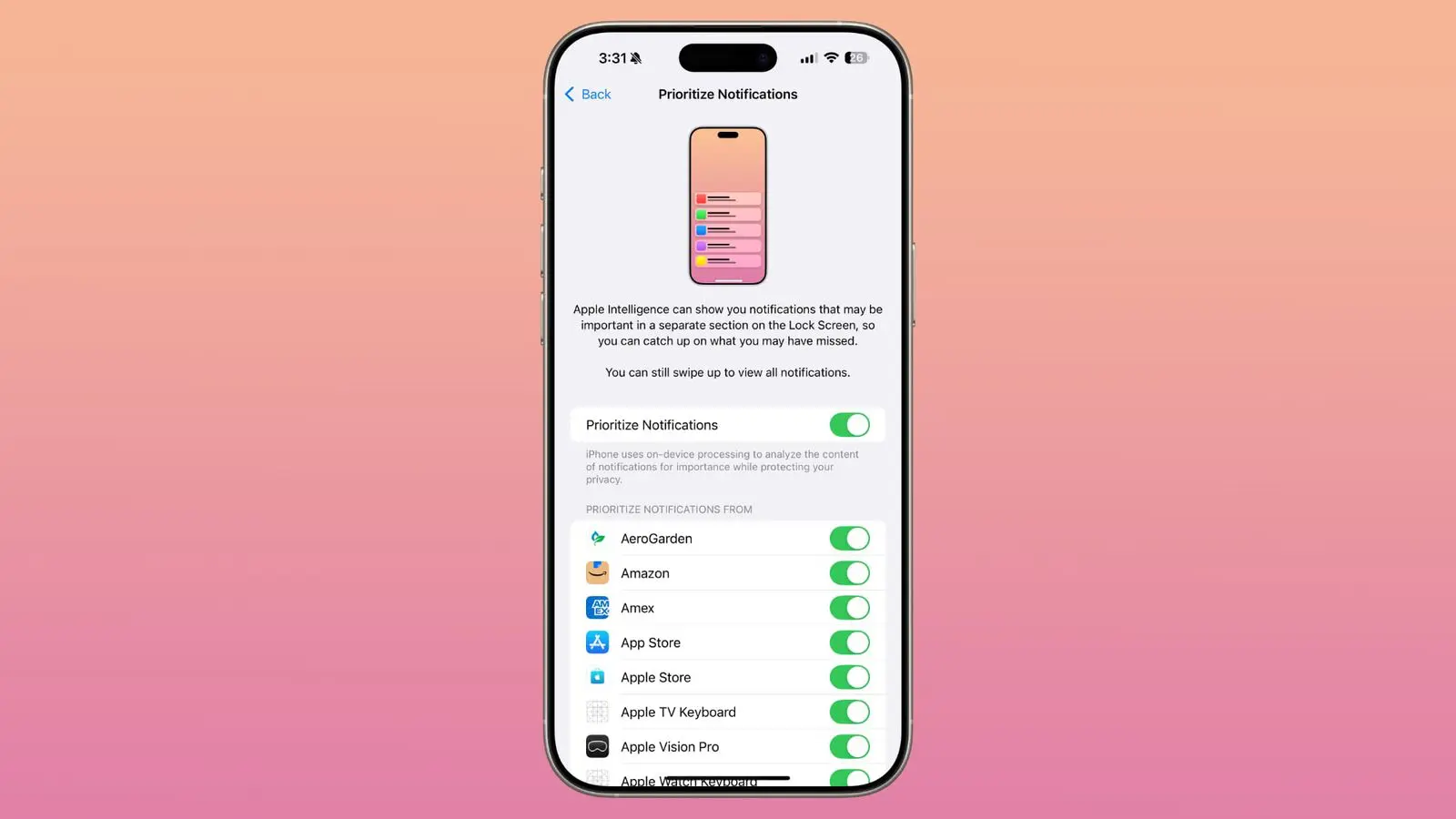 Prioritize Notifications ใช้ Apple Intelligence ในการวิเคราะห์แล้วเลือกว่าจะต้องแสดงการแจ้งเตือนอันไหนที่สำคัญก่อน พร้อมมี Label ระบุว่าอันไหนสำคัญ โดยผู้ใช้สามารถปัดเพื่อดูการแจ้งเตือนทั้งหมดได้ด้วย