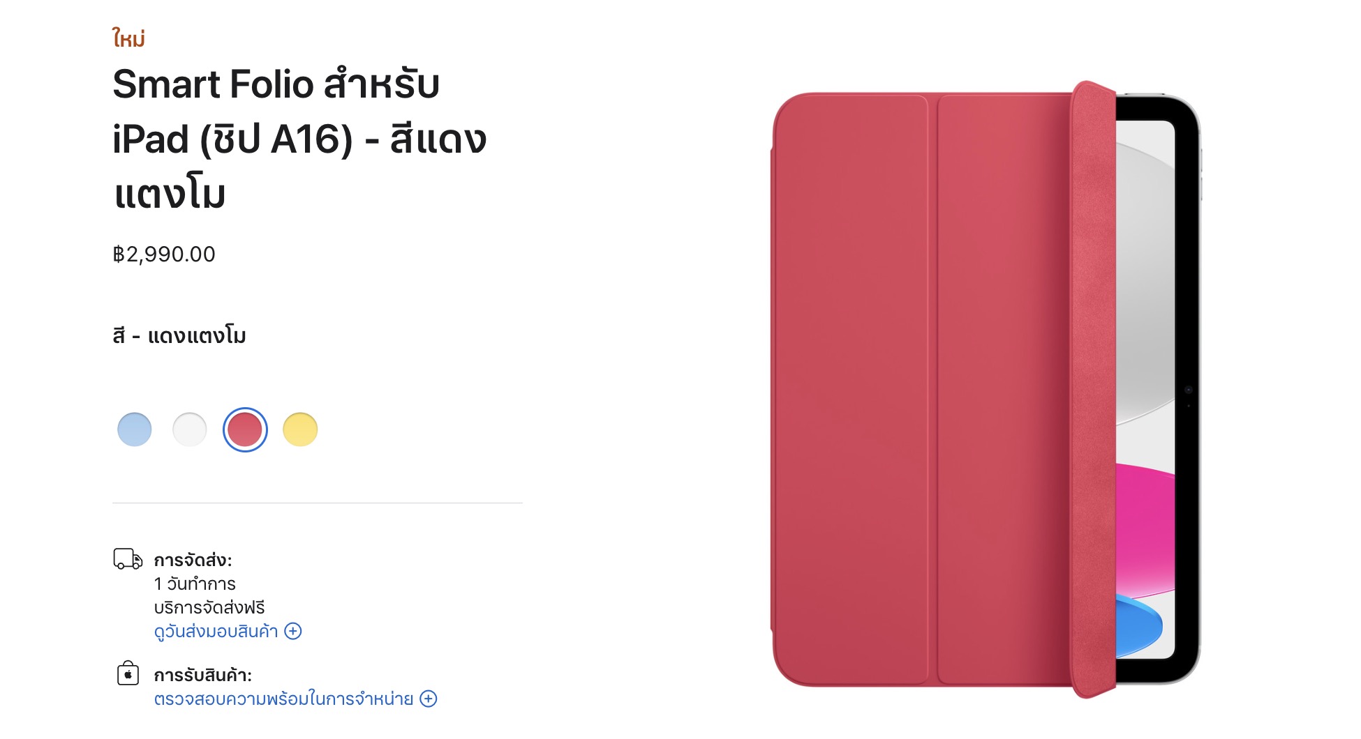 นอกจากนี้ Apple ยังเปิดขาย Smart Folio สำหรับ iPad (ชิป A16) ที่เพิ่งเปิดตัวใหม่ด้วย มาพร้อม 4 สี ได้แก่ สีท้องฟ้า สีขาว สีแดงแตงโม สีเหลืองเลมอน [Smart Folio]