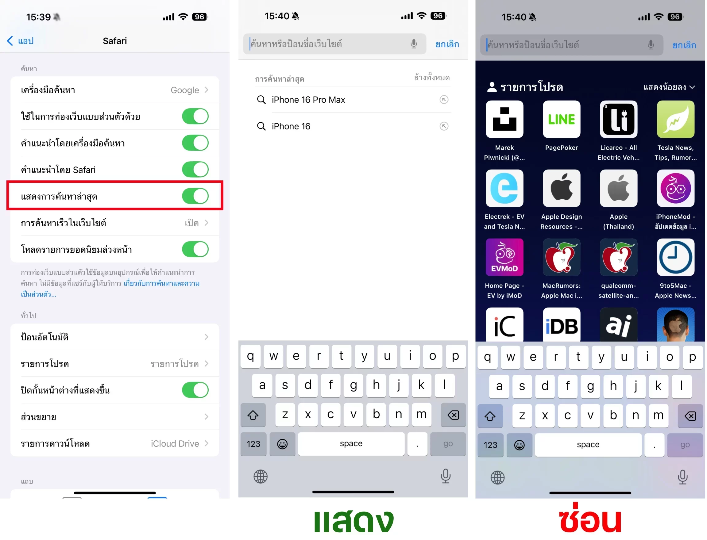 หากเลื่อนเปิด “แสดงผลการค้นหาล่าสุด” ในแอป Safari ระบบจะแสดงรายการคำค้นหาล่าสุดที่ผู้ใช้พิมพ์ใน Safar ส่วนถ้าเลื่อนปิด ระบบก็จะ “ซ่อน” ไม่แสดงผลการค้นหาล่าสุด