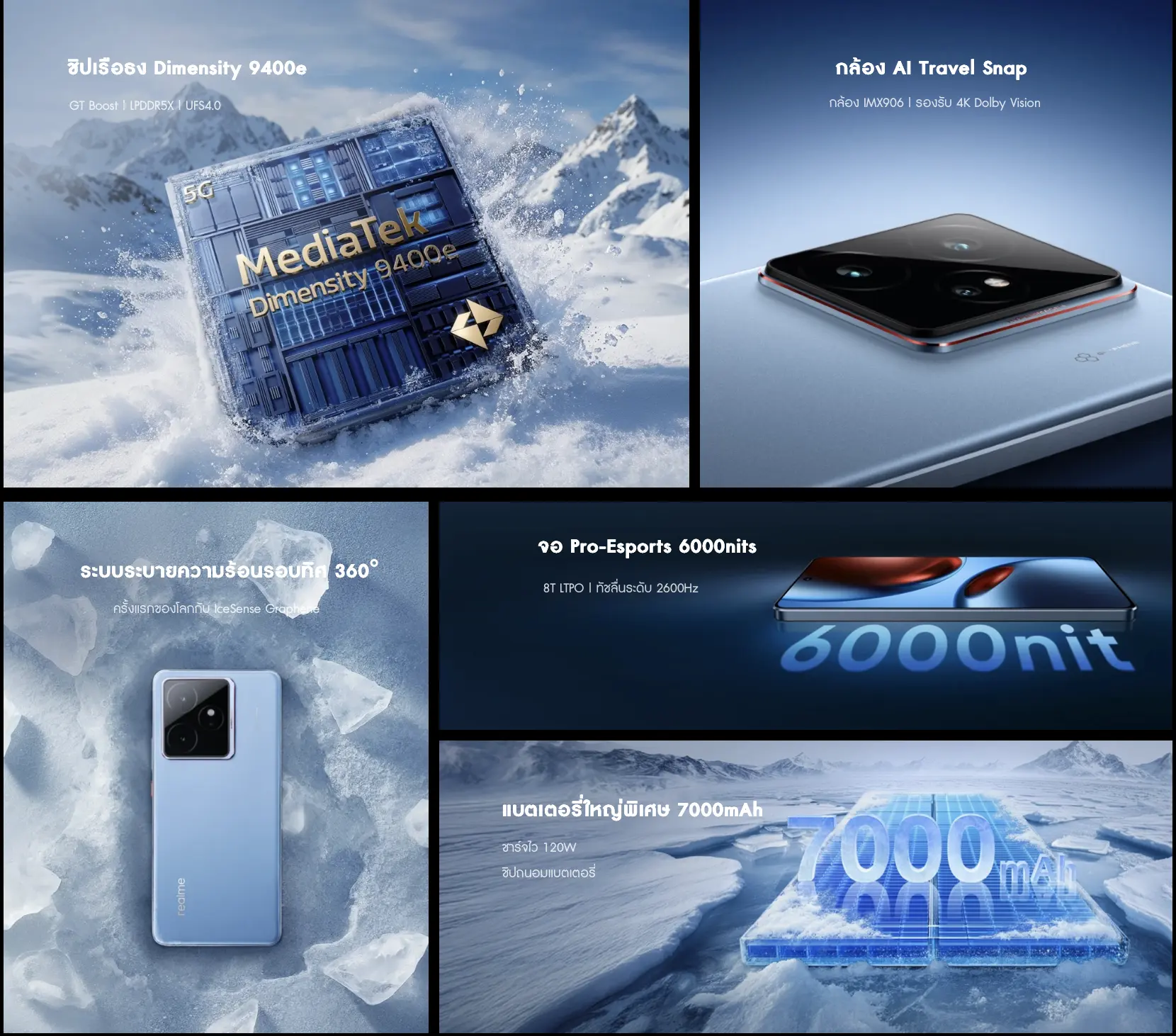 Realme GT7 มาพร้อมหน้าจอแสดงผลAMOLED ขนาด 6.78 นิ้ว อัตรารีเฟรช 120Hz ความสว่างสูงสุด 6,000 nit แบตเตอรี่ความจุ 7,000mAh ชาร์จไว 120W ชิปเซ็ต MediaTek Dimensity 9400e