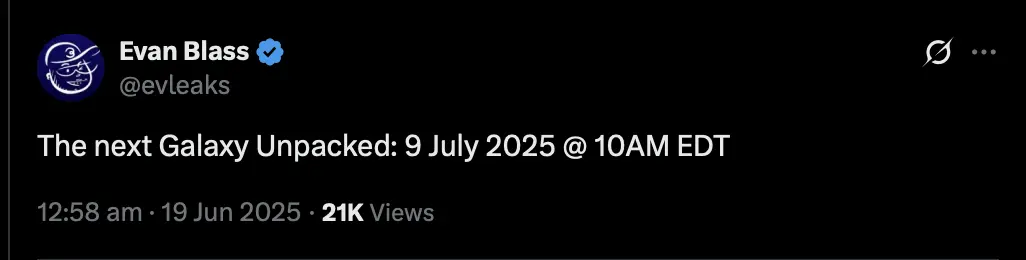 ข้อมูลจาก @evleaks บน X ซึ่งโพสต์ในวันนี้ว่า งาน Galaxy Unpacked ครั้งต่อไปจะจัดขึ้นในวันที่ 9 ก.ค. เวลา 10.00 น. หากแปลงเป็นเวลาในประเทศไทย จะตรงกับ ประมาณเย็นวันที่ 9 ก.ค. (ตามโซน Asia/Bangkok) แต่ยังไม่มีการยืนยันอย่างเป็นทางการจาก Samsung แต่แหล่งข่าวในวงการมักมีความแม่นยำสูง