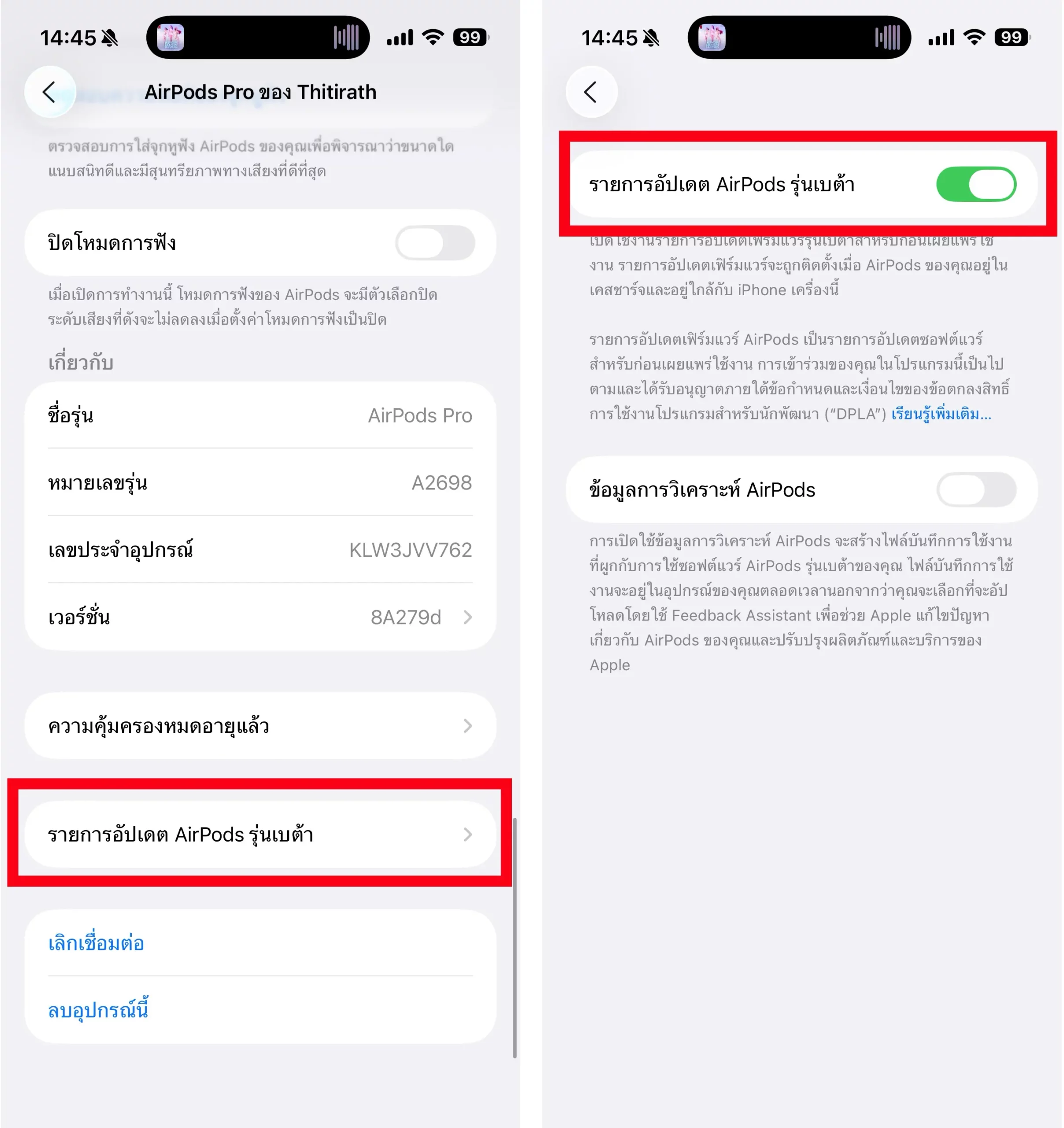 วิธีการตั้งค่าให้ AirPods อัปเดต AirPods Firmware เวอร์ชัน Beta ทำได้โดย เชื่อมต่อ AirPods เข้ากับ iPhone ที่ติดตั้ง iOS 26 Beta > ไปที่การตั้งค่า > AirPods ที่เช่ือมต่อ > รายการอัปเดต AirPods รุ่น Beta > จากนั้นรอ AirPods อัปเดตเวอร์ชัน Beta จนเสร็จ