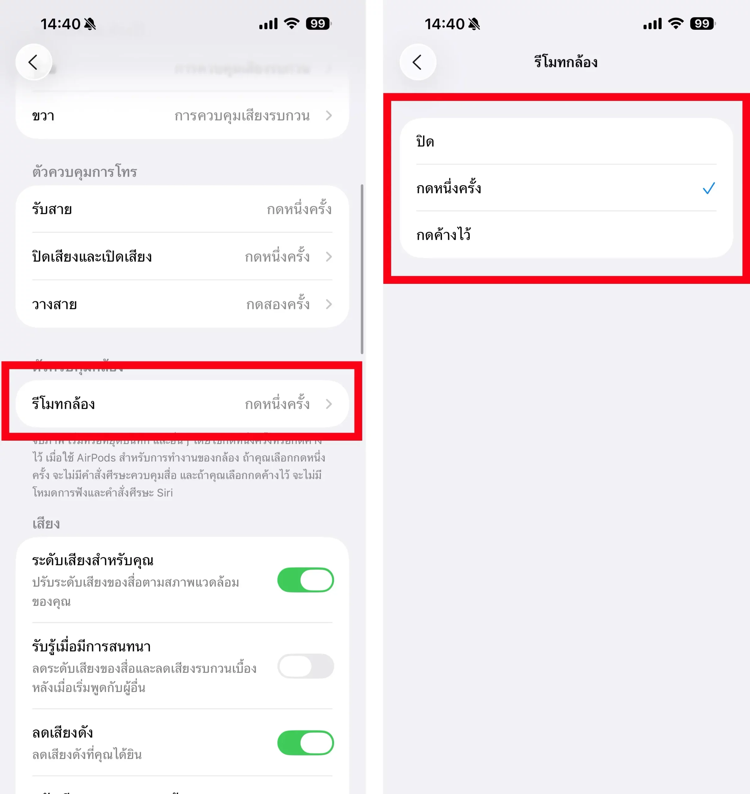 หลังจากอัปเดต AirPods Firmware ให้เป็นเวอร์ชัน Beta เสร็จแล้ว ให้เข้าไปที่การตั้งค่า > AirPods ที่เช่ือมต่อ > จะมีเมนู “รีโมทกล้อง” แตะเข้าไปตั้งค่าได้เลย > เลือกได้ว่าจะให้กดแบบไหนเพื่อควบคุมกล้อง