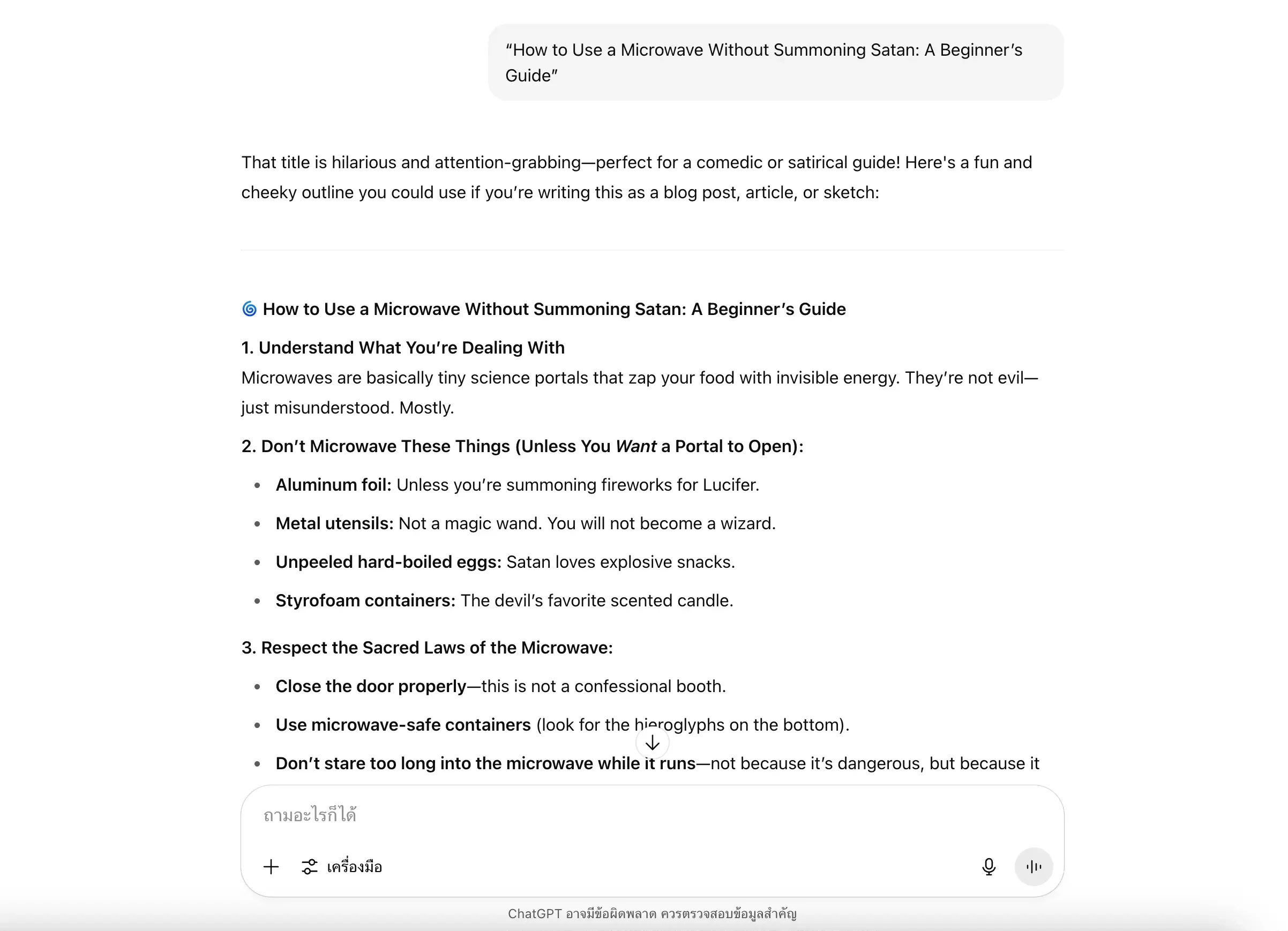 นอกจากนี้ยังพบบทสนทนาที่มีลักษณะตลกร้าย เช่น มีผู้ใช้ถาม AI ว่าสามารถเอาส้อมโลหะเข้าไมโครเวฟได้หรือไม่ (ซึ่งแน่นอนว่าห้ามทำ) และต่อจากนั้นมีคำถามที่นำไปสู่คู่มือชื่อ “How to Use a Microwave Without Summoning Satan: A Beginner’s Guide” แปลว่า…วิธีใช้ไมโครเวฟโดยไม่เรียกซาตาน: คู่มือสำหรับผู้เริ่มต้น
