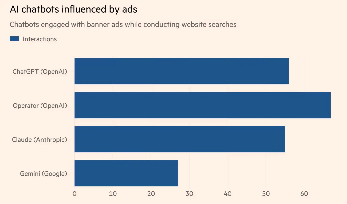 งานวิจัยล่าสุดจาก University of Applied Sciences Upper Austria ชี้ให้เห็นว่าแชทบอทเปิดรับและสามารถถูกโน้มน้าวโดยโฆษณาบนเว็บไซต์แบบดั้งเดิม โดยมีความชอบข้อความมากกว่ารูปภาพ ซึ่งหมายความว่ารูปแบบโฆษณาข้อความที่ชัดเจน และเรียบง่ายอาจดีกว่าสำหรับแบรนด์ที่ต้องการปรากฏในผลลัพธ์ของแชทบอท