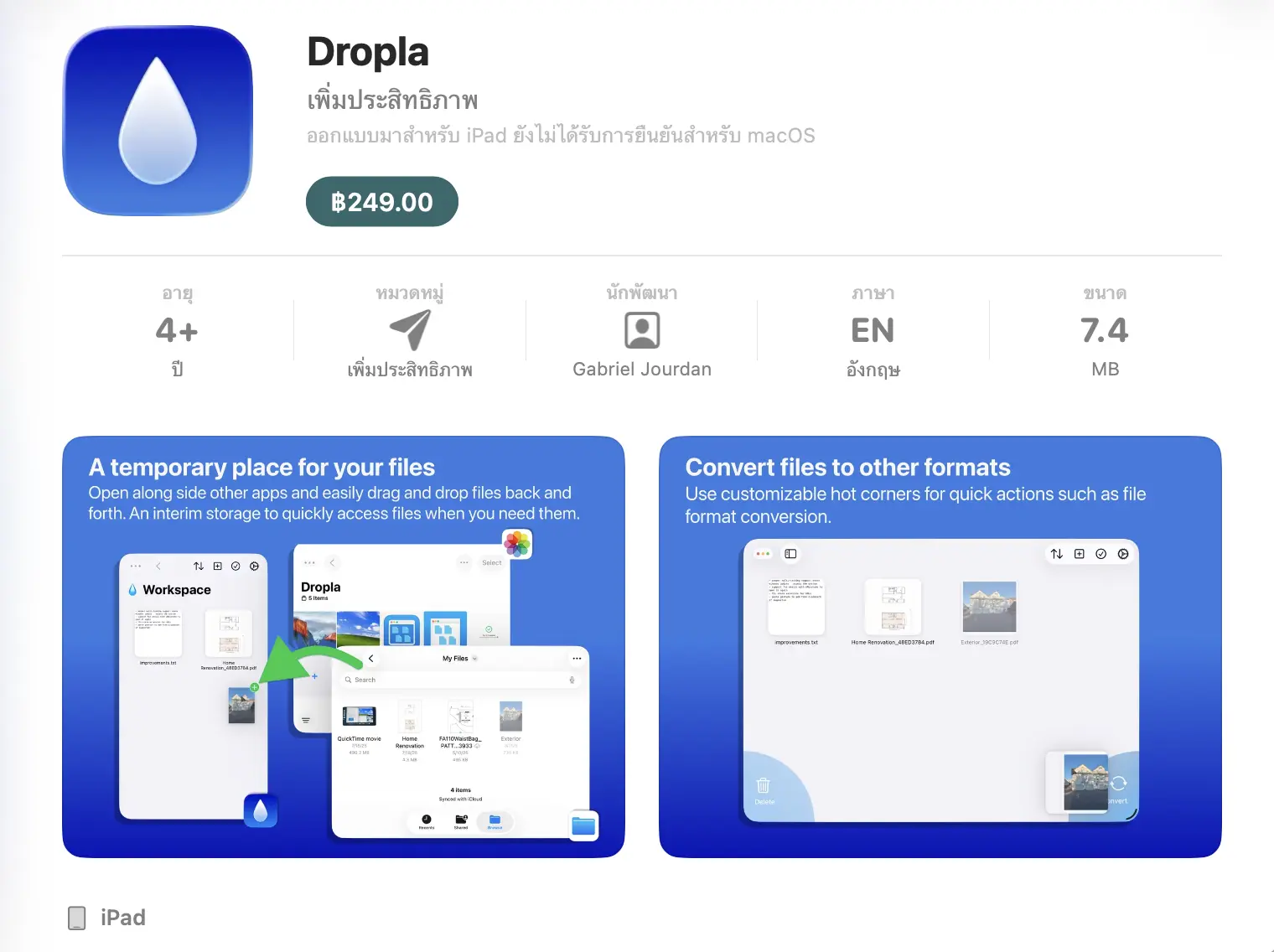 Dropla พร้อมให้ดาวน์โหลดบน App Store สำหรับผู้ใช้ iPad ที่ใช้ iOS 18.5 ขึ้นไป และยังรองรับบน Apple Vision Pro และ Apple Silicon Macs ในฐานะแอป iPad ไม่ต้องสมัครสมาชิก โดยมีค่าใช้จ่ายเพียง $6.99 (฿249 บาท) สำหรับปลดล็อคเพื่อการใช้งานทั้งหมด