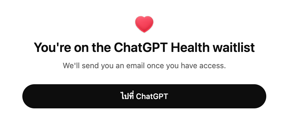ChatGPT Health เริ่มเปิดให้ลงชื่อเข้ารอใช้งานผ่านกลุ่มผู้ทดสอบเบต้า เมื่อลงชื่อ Waitlist เพื่อขอสิทธิ์เข้าใช้งานแล้ว จะมีการส่งเมล์เข้ามา