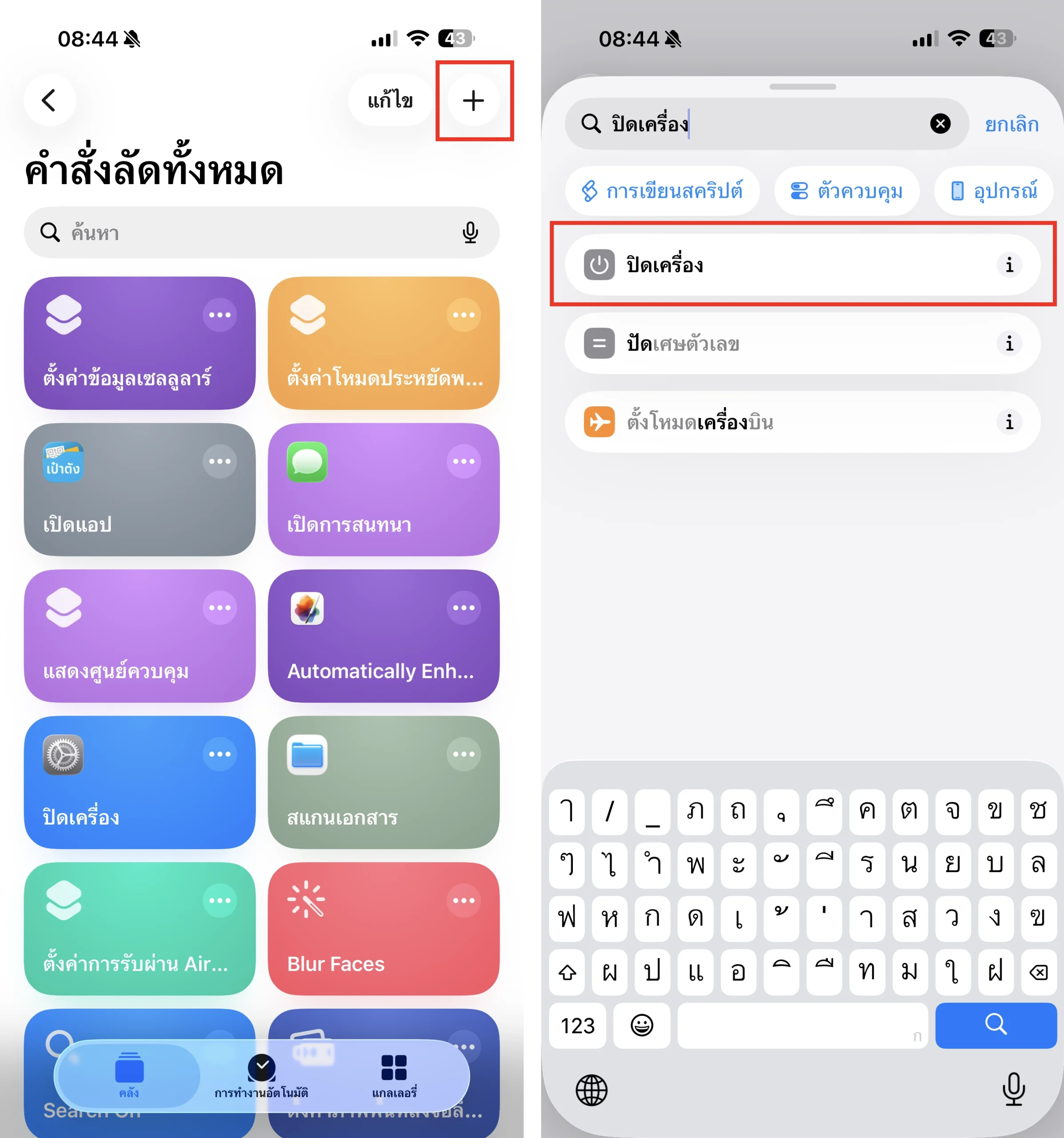 เปิดแอป Shortcut (คำสั่งลัด) > แตะ “+” ที่มุมบนขวา > ค้นหาคำสั่งลัดชื่อว่า ปิดเครื่อง หรือ Shut Down