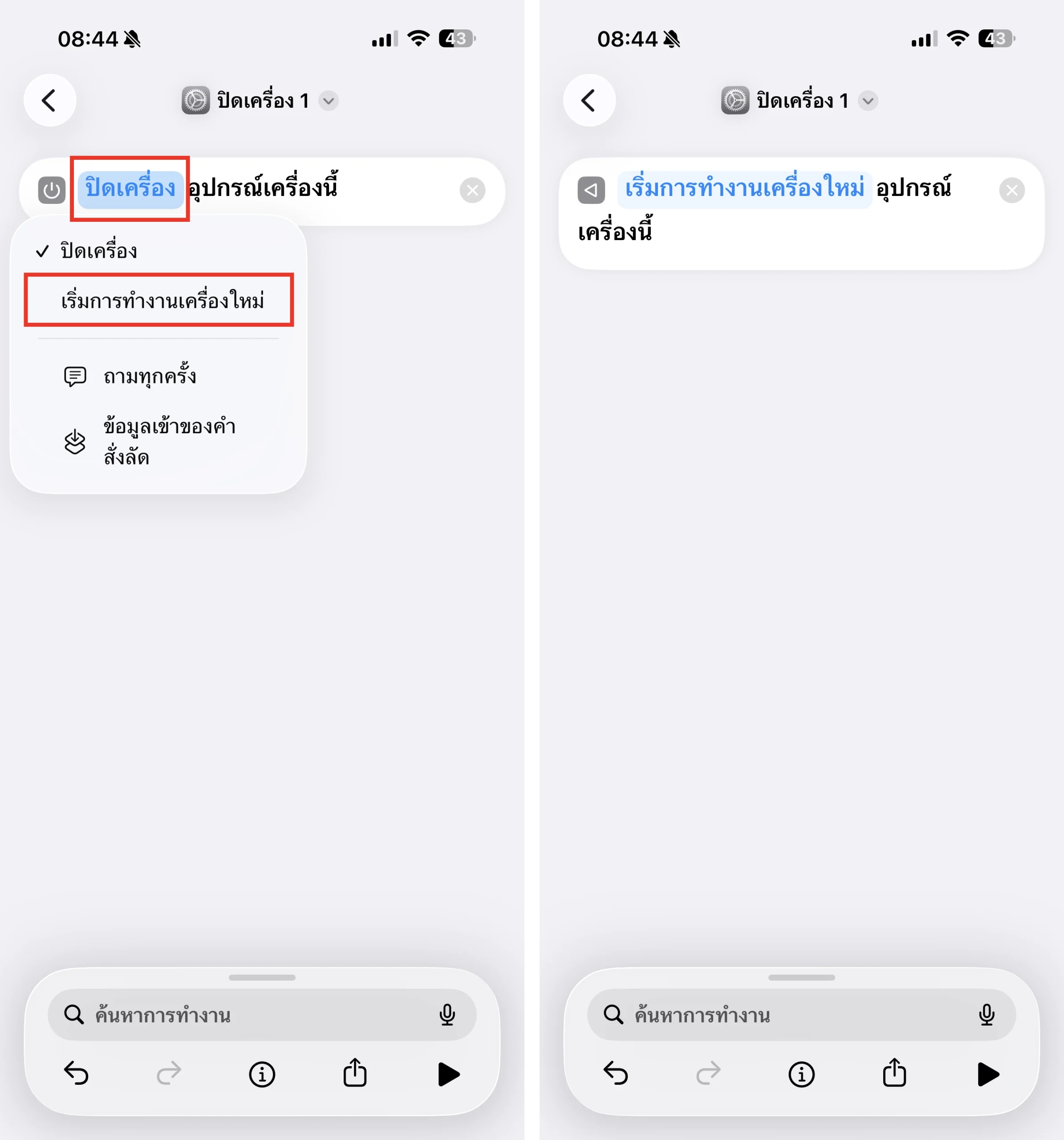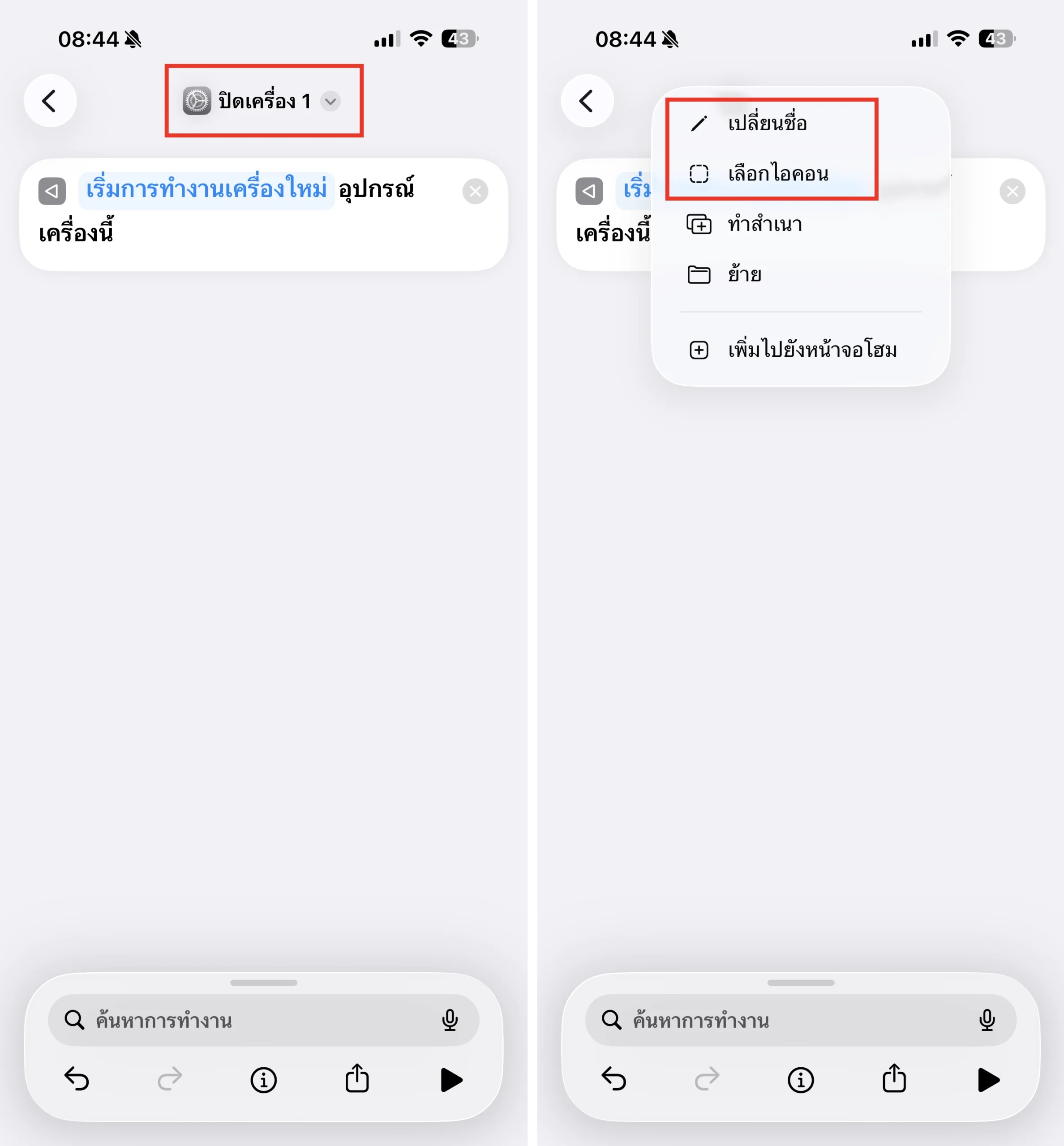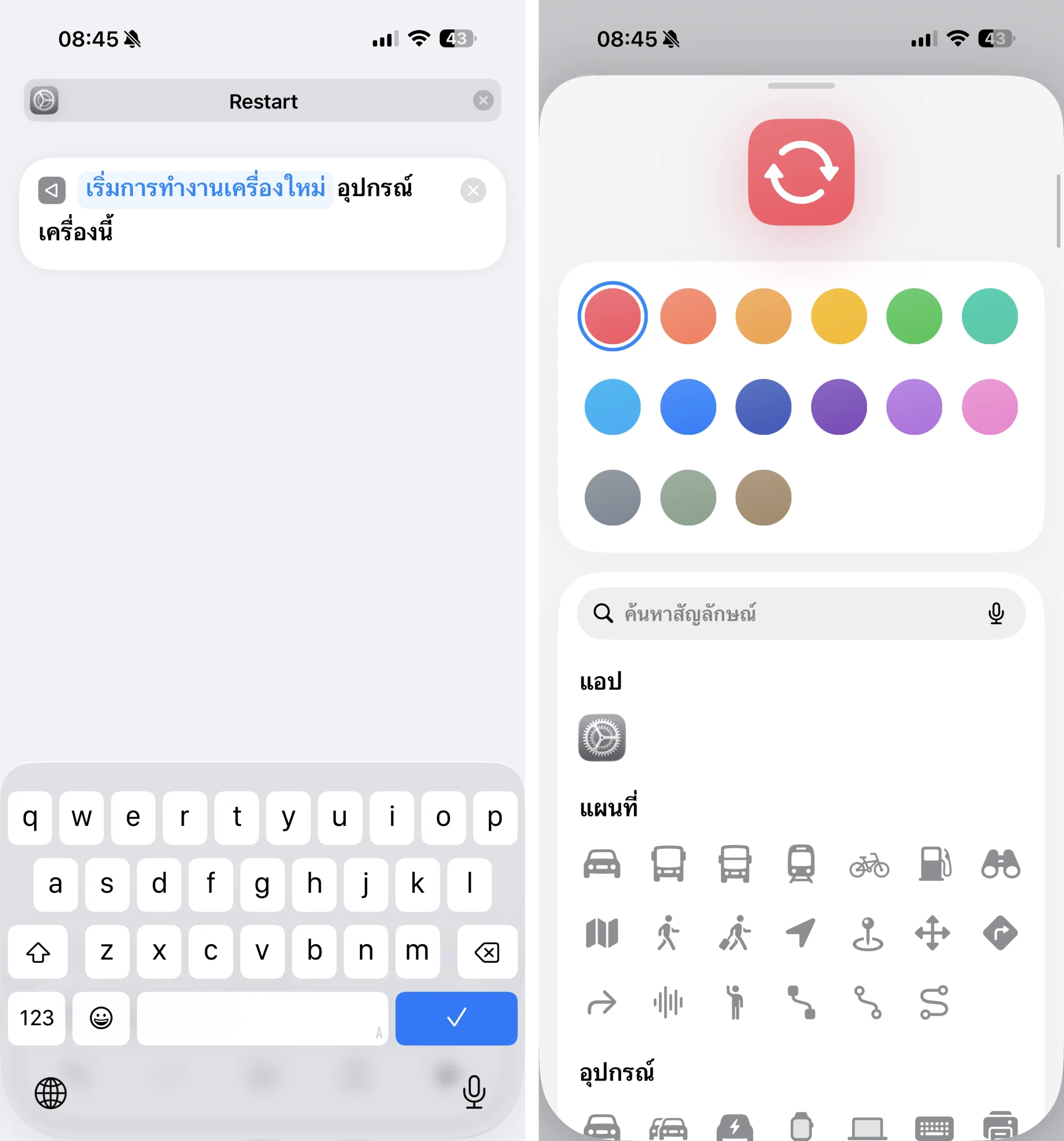 แตะชื่อคำสั่งลัดที่ด้านบน > แตะ เปลี่ยนชื่อ เพื่อเปลี่ยนชื่อคำสั่งลัด (เช่น Restart), แตะ เลือกไอคอน ตามต้องการ