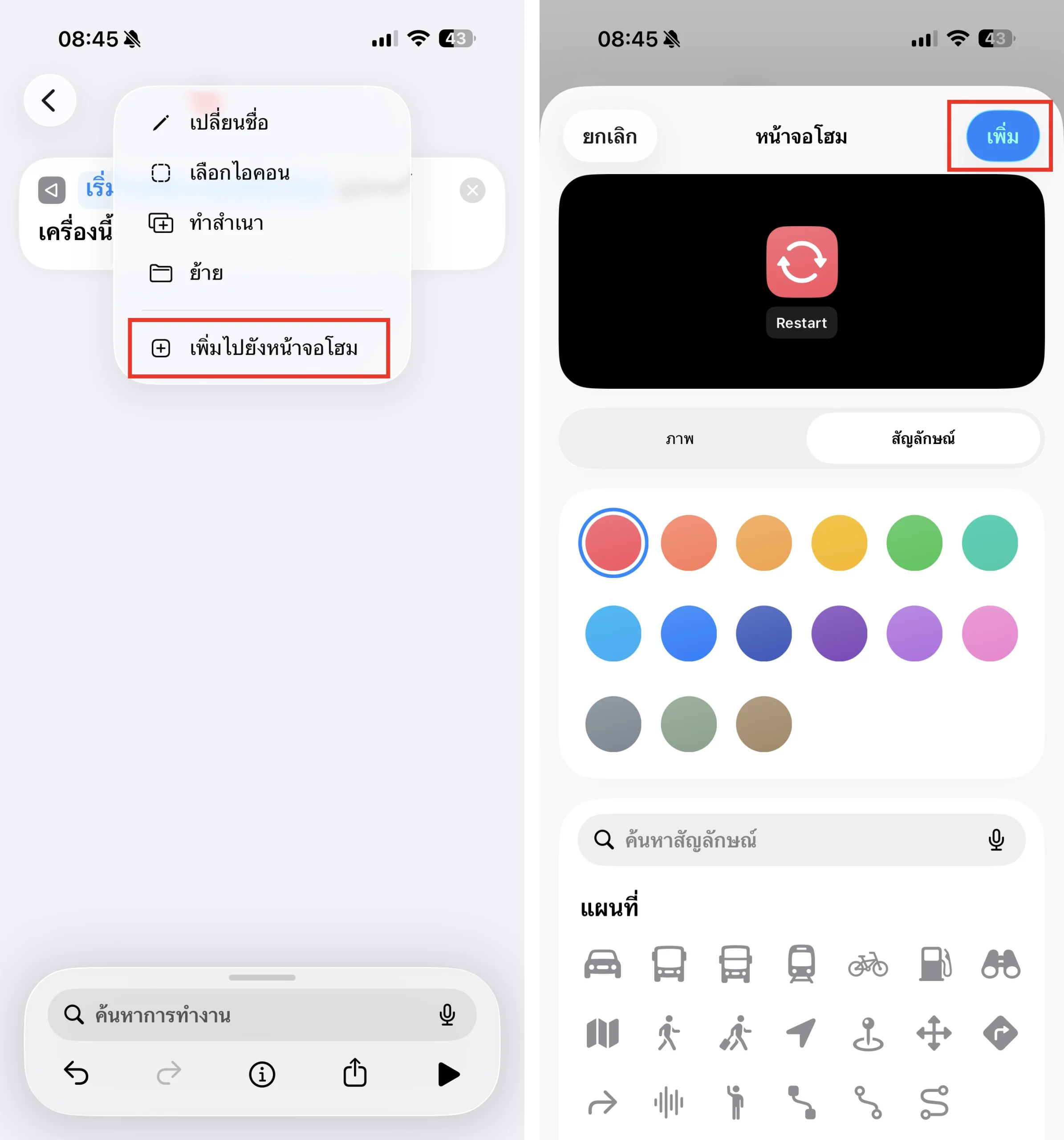 แตะที่ชื่อคำสั่งลัดอีกครั้ง > แตะ เพิ่มไปยังหน้าจอโฮม > ตั้งชื่อคำสั่งลัด พร้อมเลือกไอคอนที่ต้องการ (ถ้าต้องการเปลี่ยน) > แตะ เพิ่ม