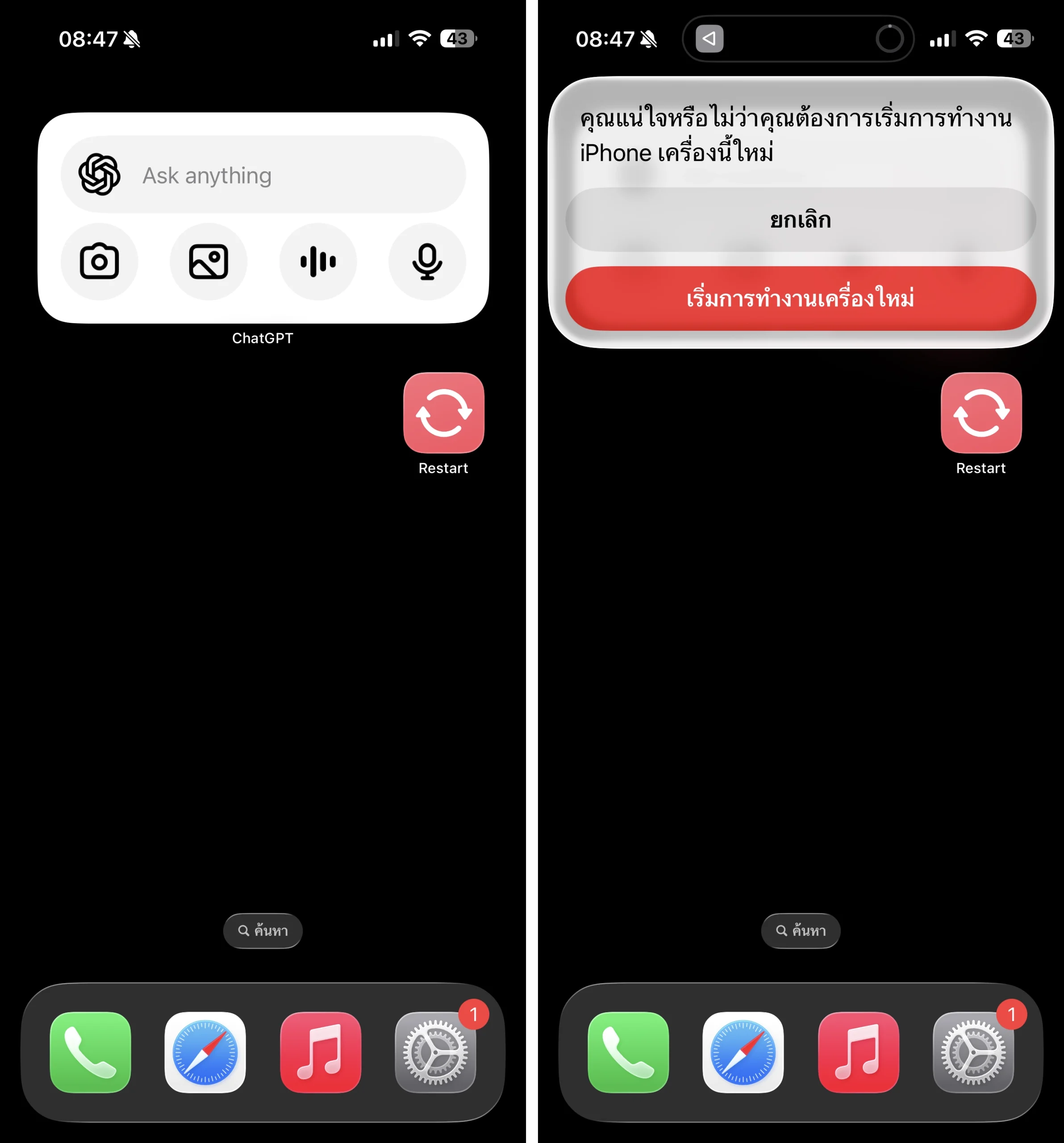 เพียงเท่านี้ก็สามารถใช้งานคำสั่งลัด Restart เครื่อง iPhone จากไอคอนในหน้าจอโฮมได้แล้ว