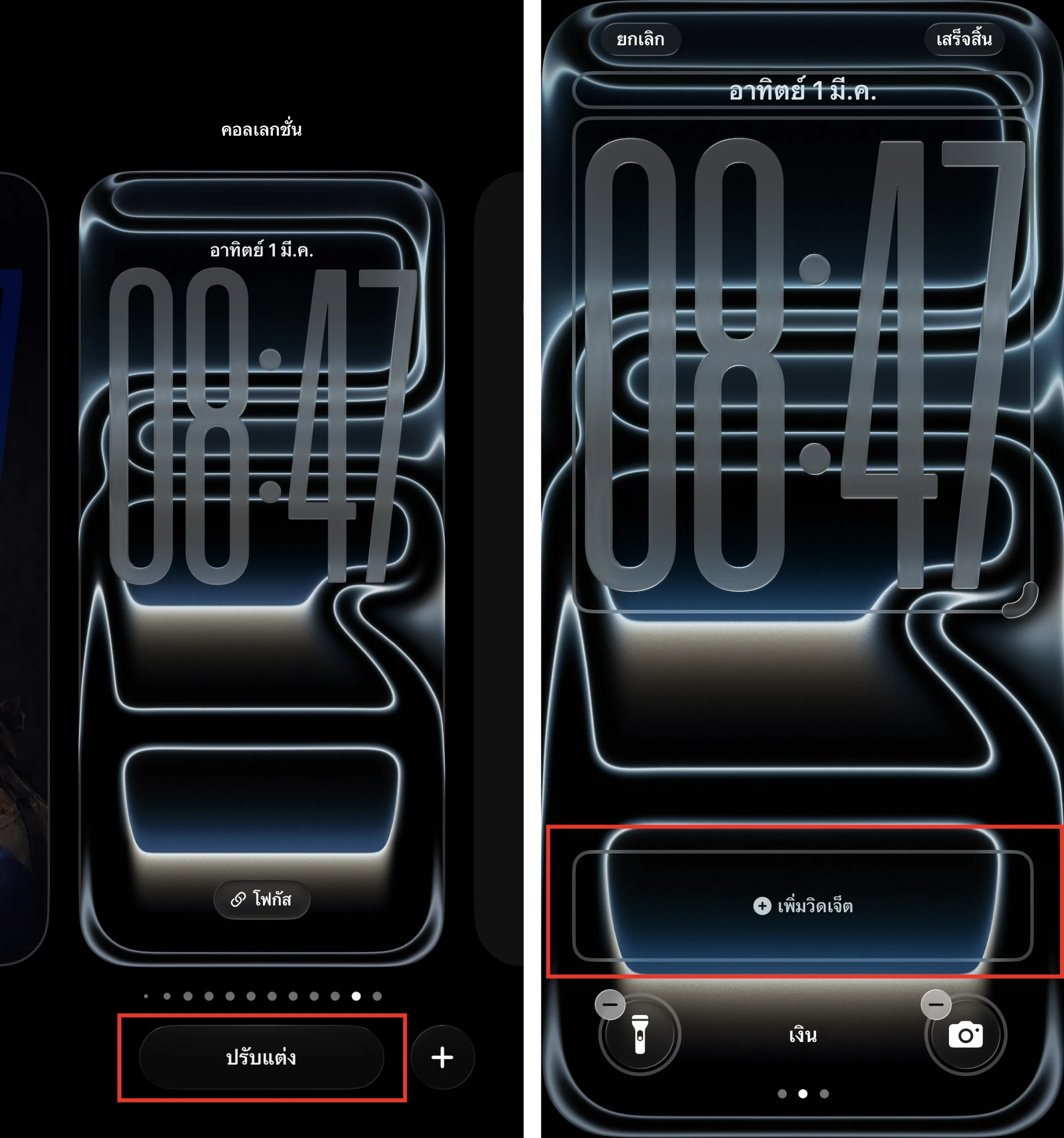 แตะที่หน้าจอล็อกค้างไว้ > แตะ ปรับแต่ง > แตะ เพิ่มวิตเจ็ต
