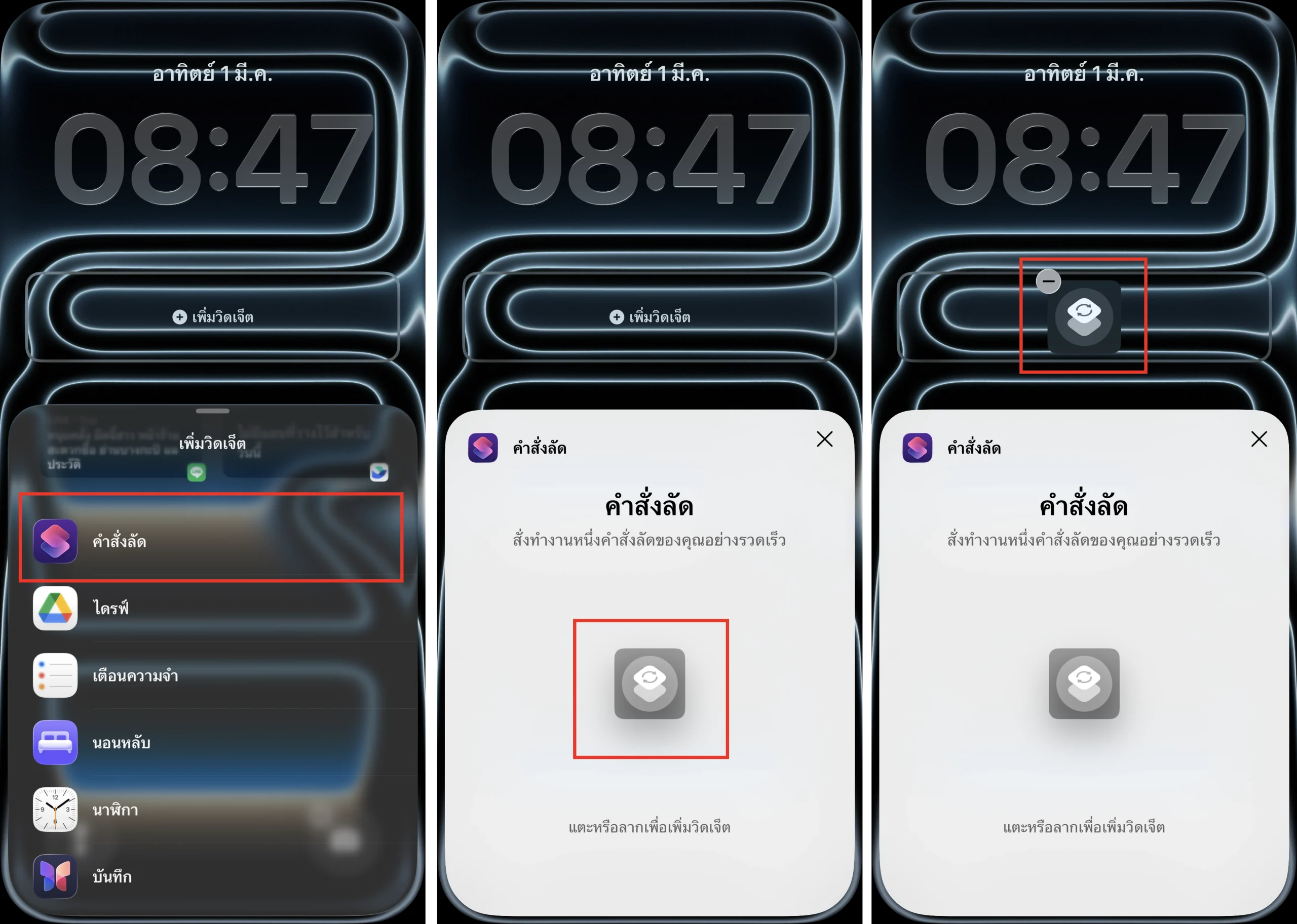 เลือกวิดเจ็ต คำสั่งลัด > แตะ เพิ่มคำสั่งลัด > แตะที่ไอคอนคำสั่งลัดอีกครั้ง
