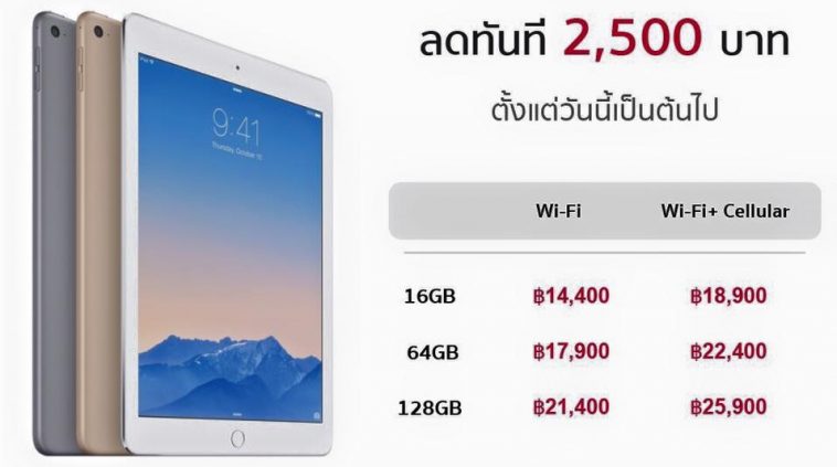 - iPad Air 2 Wi-Fi + Cellular ความจุ 128 GB ราคา 25,900 บาท (เฉพาะหน้าร้าน)