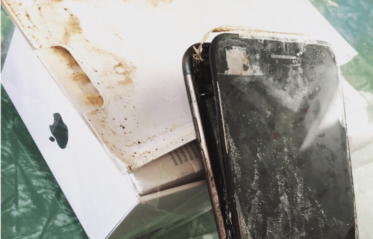 ในภาพแสดงให้เห็น iPhone 7 Plus สีดำ ลักษณะตัวเครื่องโดยรวมเสียหายหนัก เป็นรอยไหม้ กระจกหน้าแตกร้าว และตัวเครื่องเปิดอ้าออกมา คาดว่า เกิดจากแรงระเบิดจากภายใน ส่วนตัวกล่องและอุปกรณ์ที่อยู่ในกล่องก็เสียหายมีรอยไหม้เช่นเดียวกัน