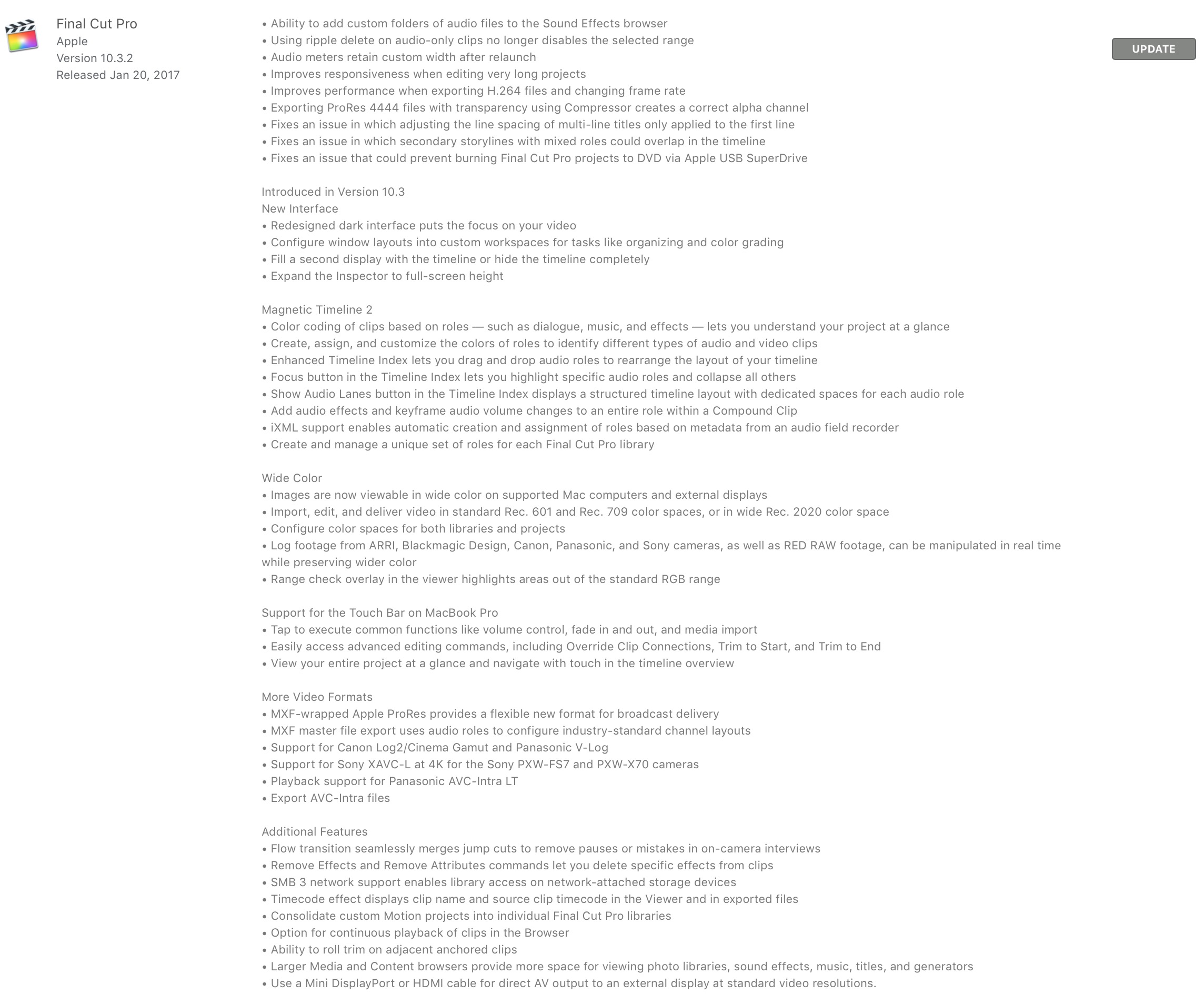 Final Cut Pro X 10.3.2 อัปเดตใหม่แก้ไขข้อบกพร่องของแอปพลิเคชันและปรับปรุงประสิทธิภาพของแอปโดยได้เพิ่มความสามารถในการ เพิ่ม Custom Folder และไฟล์เสียงต่างๆ เข้าปยังส่วนของ Sound Effect Browser   และคุณสมบัติเพิ่มเติมอื่นๆ อีกมากมายชมจากรายการด้านล่างได้เลย