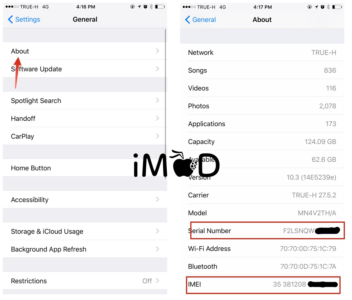 - การตั้งค่า(Settings)> ทั่วไป (General) > เกี่ยวกับ(About)> หมายเลขประจำเครื่อง(Serial Number)