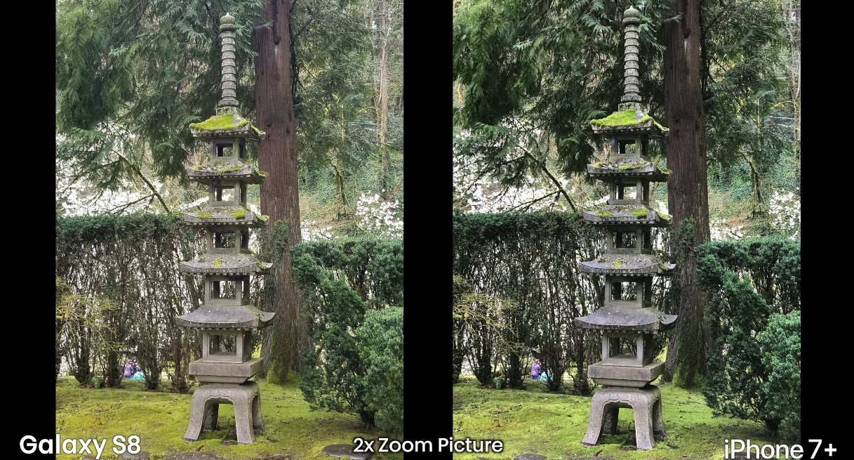 การเก็บภาพแบบซูม 2 เท่า (2x) ความละเอียดค่อนข้างใกล้เคียงกัน โดย Galaxy S8 ให้สีและแสงโดดเด่นกว่า iPhone 7 Plus และผู้ทดสอบเผยว่าความนิ่งของกล้องหลัง Galaxy S8 ทำได้ดีกว่า