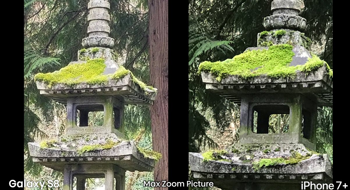 หลังจากนั้นผู้ทดสอบได้ทำการซูมภาพให้มากที่สุด โดย Galaxy S8 สามารถควบคุมระบบกันภาพสั่นระหว่างการถ่ายภาพได้ดีกว่า iPhone 7 Plus แต่ iPhone 7 Plus สามารถซูมภาพได้ใกล้กว่า Galaxy S8