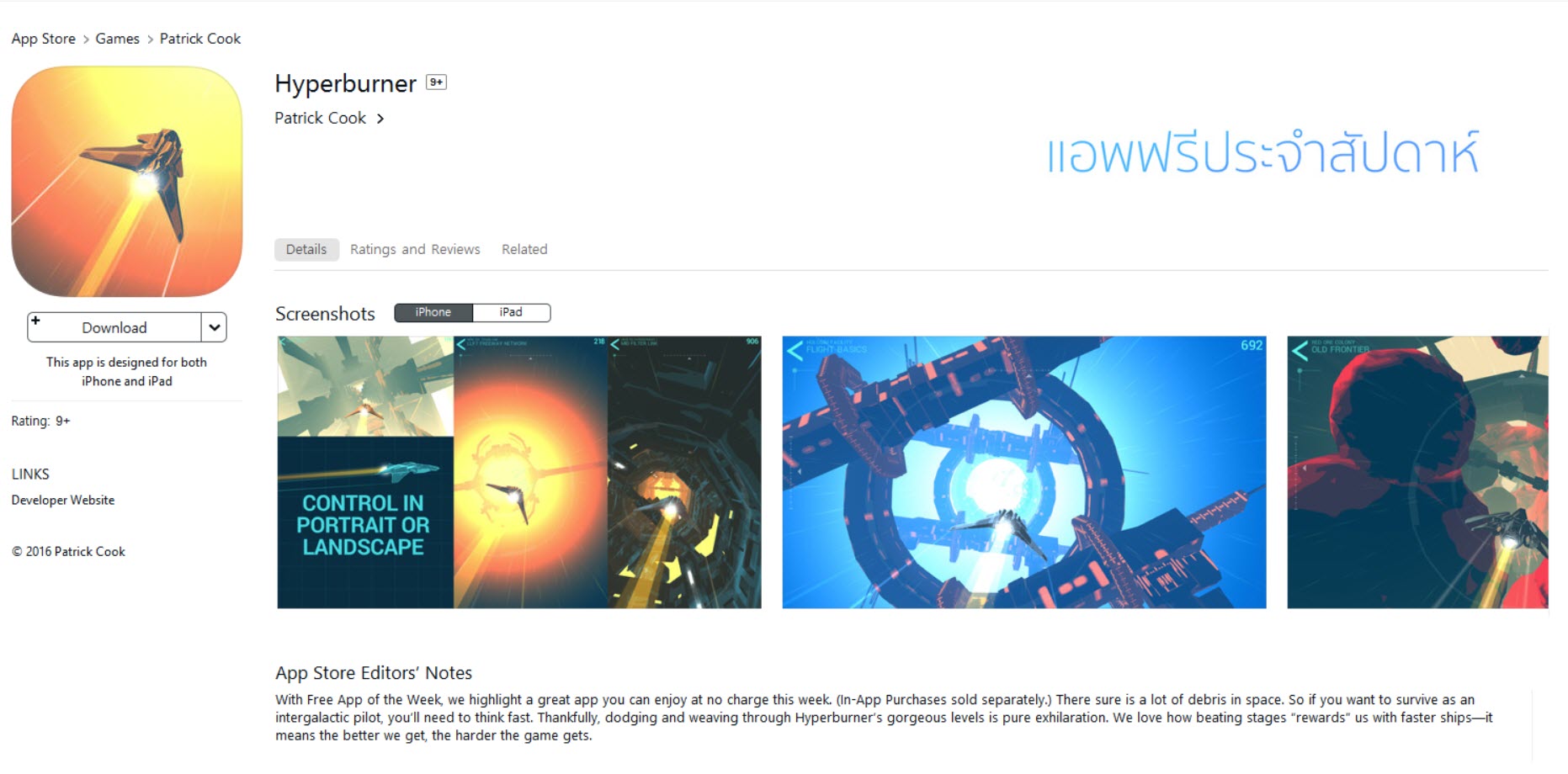 Apple เลือกให้เกม Hyperburner เป็นแอปฟรีประจำสัปดาห์ โดยเกมนี้เป็นเกมที่ให้ผู้เล่นบังคบยานอวกาศให้หลบหลีกสิ่งกีดขวางไปยังที่หมายตามเวลาที่กำหนด ซึ่งแต่ละด่านจะมีความยากง่ายตามระดับที่สูงขึ้น เมื่อเล่นผ่านไปหลายด่านก็จะสามารถปลดล็อค Zone และด่านเพิ่มเติม รวมไปถึงยานอวกาศที่มีความเร็วสูงขึ้นได้