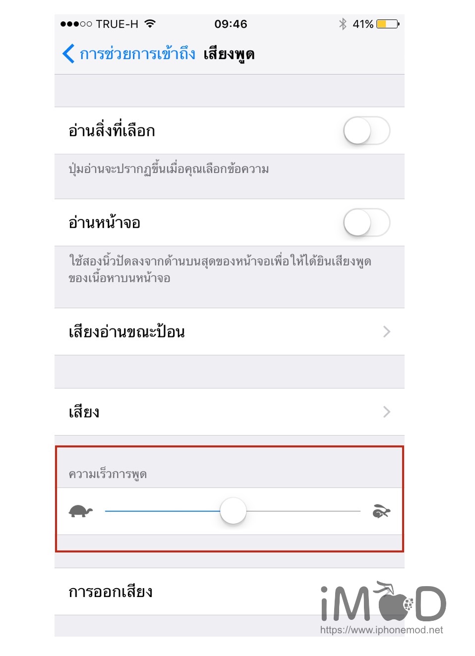 - การตั้งค่า, ทั่วไป, การช่วยการเข้าถึง, เสียงพูด