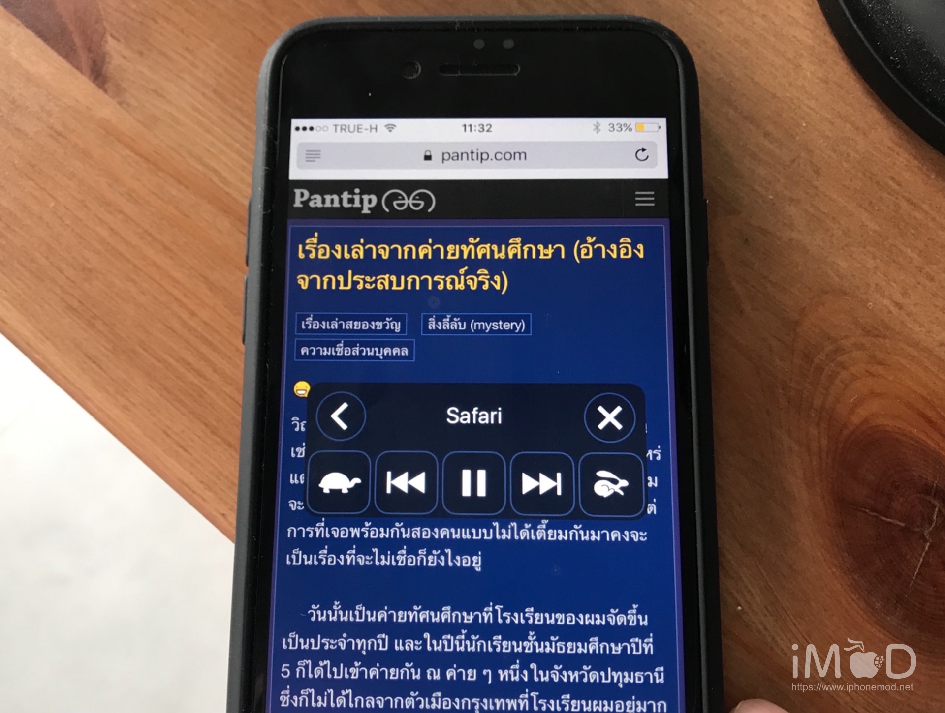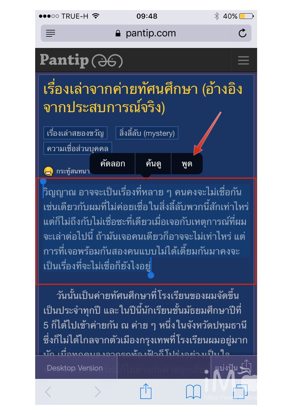 เปิดเข้าไปที่หน้าเว็บใดๆ เช่น เรื่องนี้ https://pantip.com/topic/36395572 เมื่อเข้าไปที่หน้าเว็บแล้วให้ทำการไฮไลด์เลือกข้อความที่ต้องการให้ Siri อ่าน จากนั้นเลือกที่เมนู “พูด” หรือว่า “Speak” ข้อความดังกล่าวจะถูกอ่านออกมา
