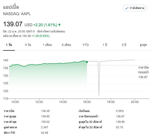 ราคาหุ้น Apple ทำสถิติสูงสุดใหม่ที่ 139 ดอลลาร์ต่อหุ้น (All-Time High)