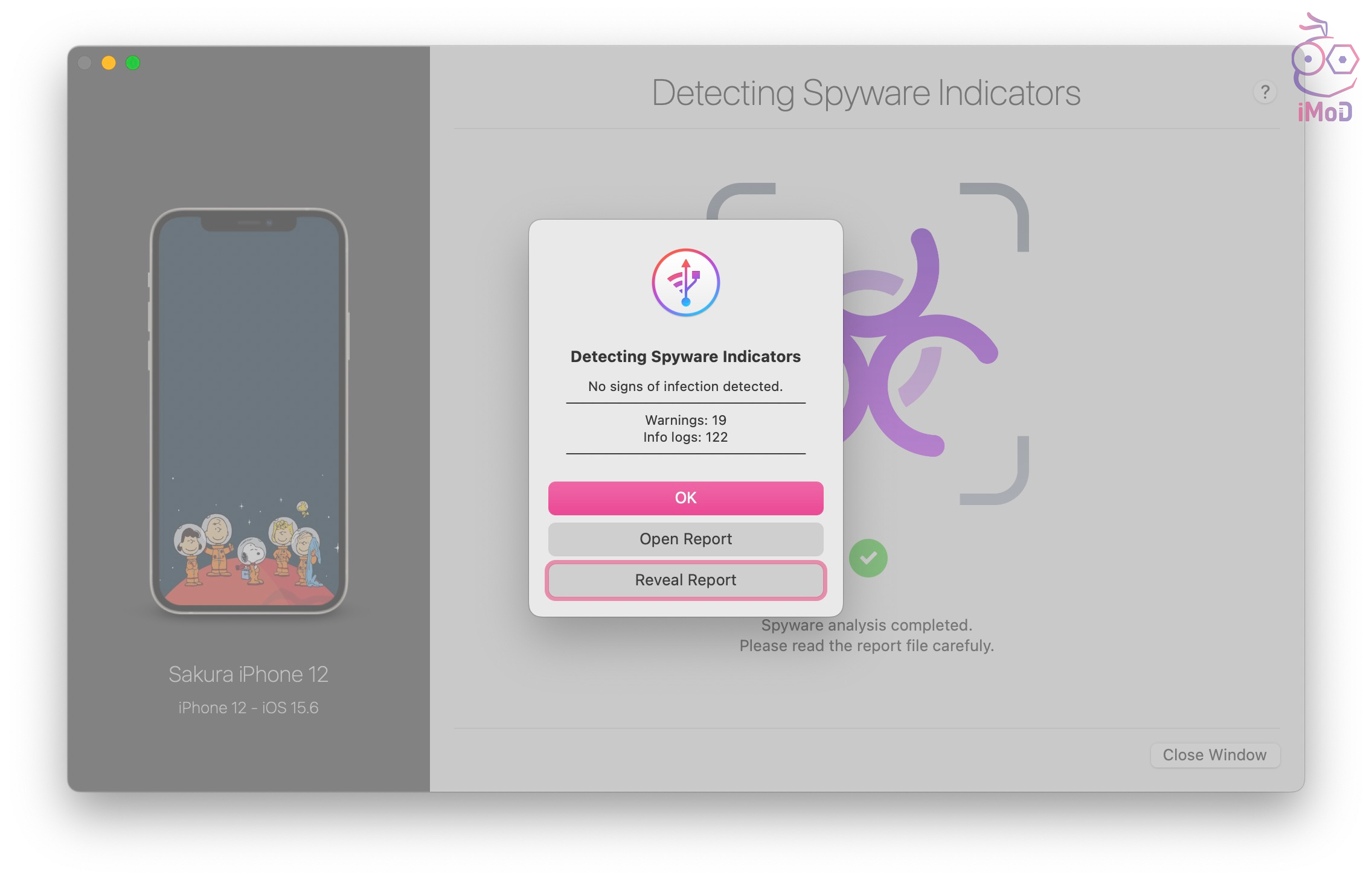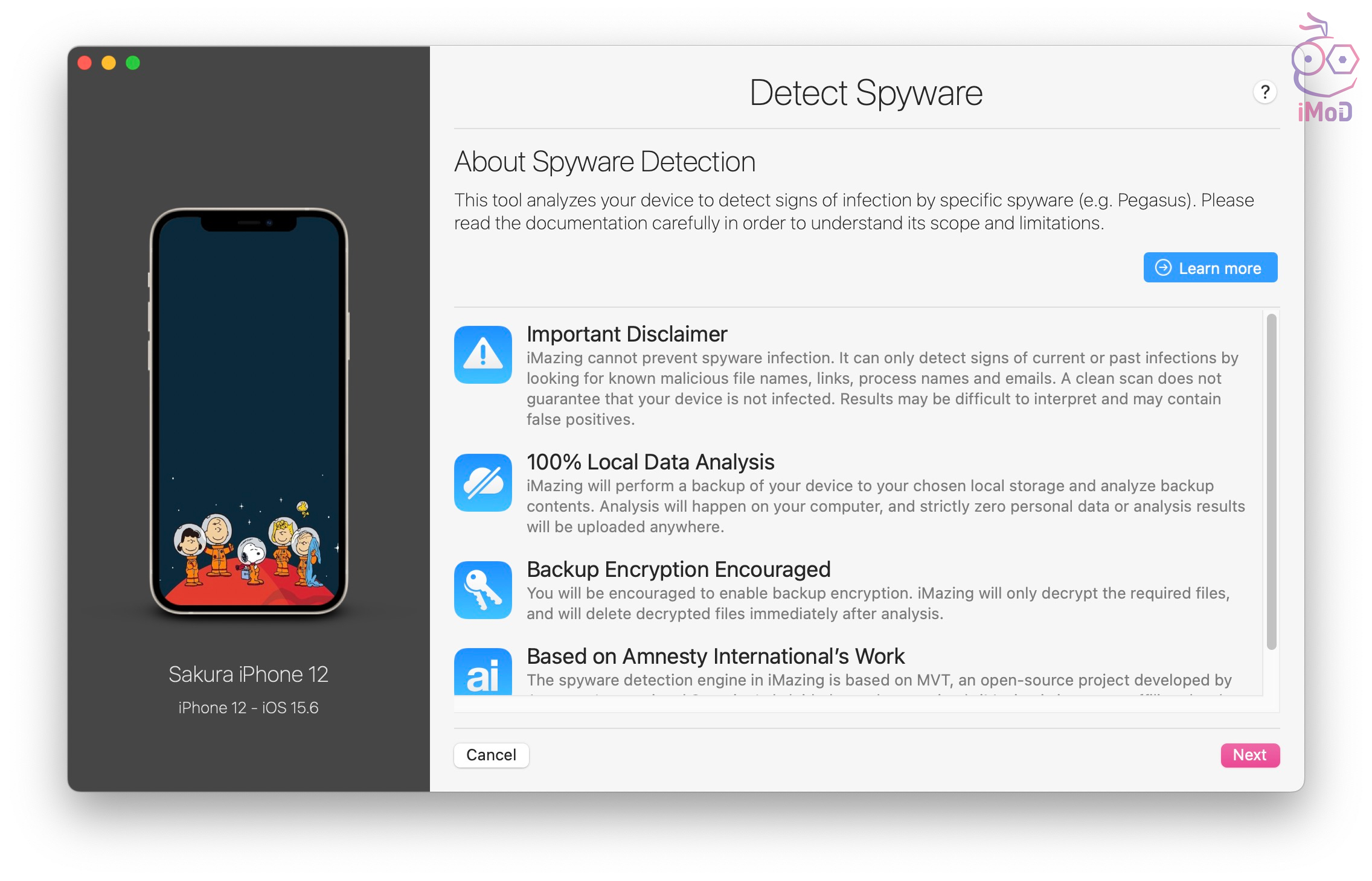 iMazing จะช่วยตรวจสอบและแจ้งเตือนให้ทราบเมื่อตรวจพบเพกาซัสหรือมัลแวร์อื่น ๆ บน iPhone แต่โปรแกรมนี้จะไม่สามารถลบสปายแวร์หรือปกป้อง iPhone จากเพกาซัสได้