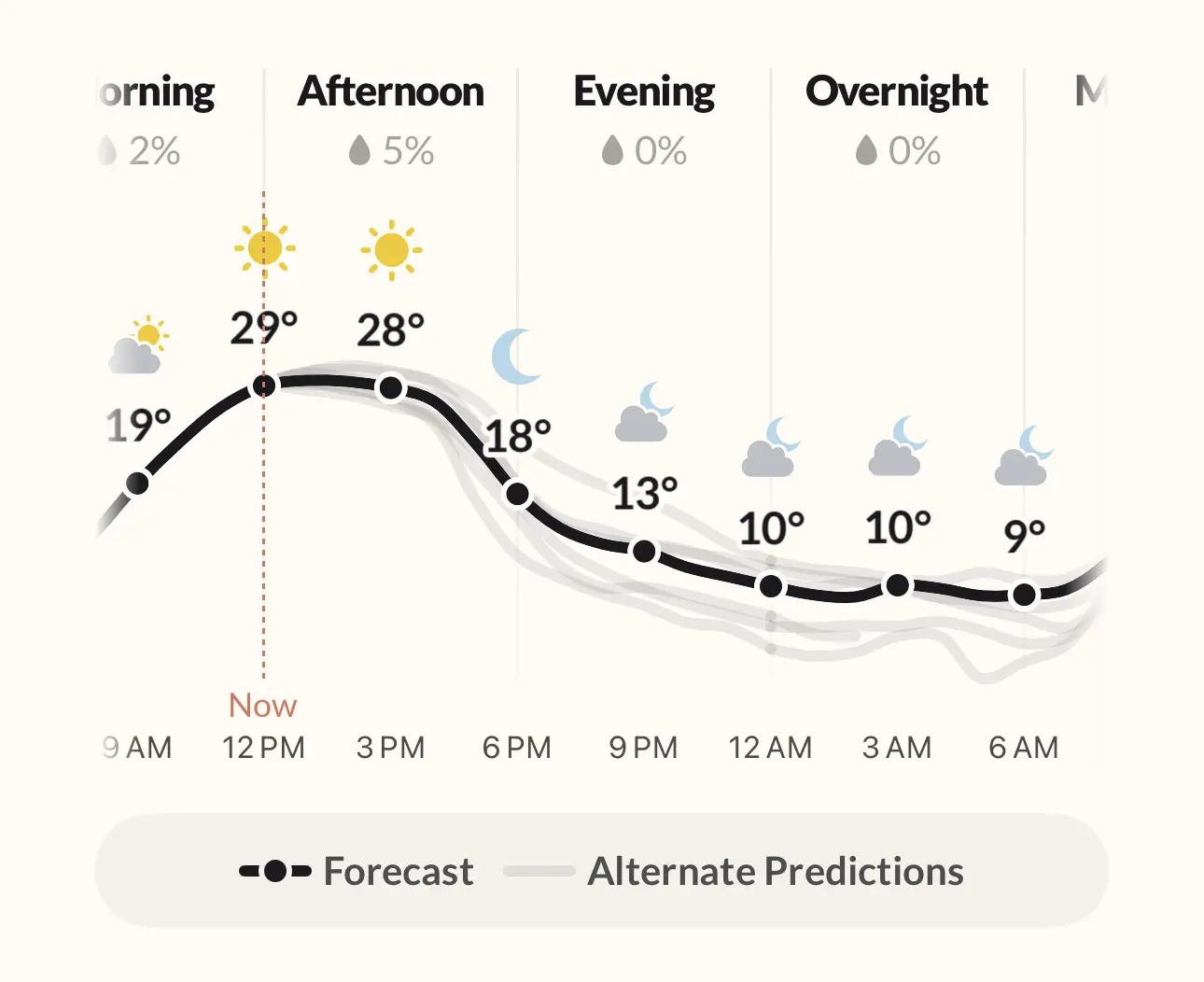 จุดเด่นของแอปนี้อย่างหนึ่งคือ จะมี “กราฟเส้นสีเทา” เพื่อแสดงความเป็นไปได้บนกราฟ Grossman ได้ให้สัมภาษณ์กับทาง TechCrunch ว่า “การพยากรณ์มักจะผิดพลาด เพราะมันคือสภาพอากาศ หนึ่งในสิ่งที่พยากรณ์ยากที่สุด และสิ่งที่เราหงุดหงิดที่สุดกับแอปพยากรณ์อากาศหลายตัวคือ คุณจะได้รับเพียง ‘คำตอบที่พวกเขาเดาว่าดีที่สุด’ โดยที่คุณไม่รู้เลยว่าพวกเขามั่นใจแค่ไหน”