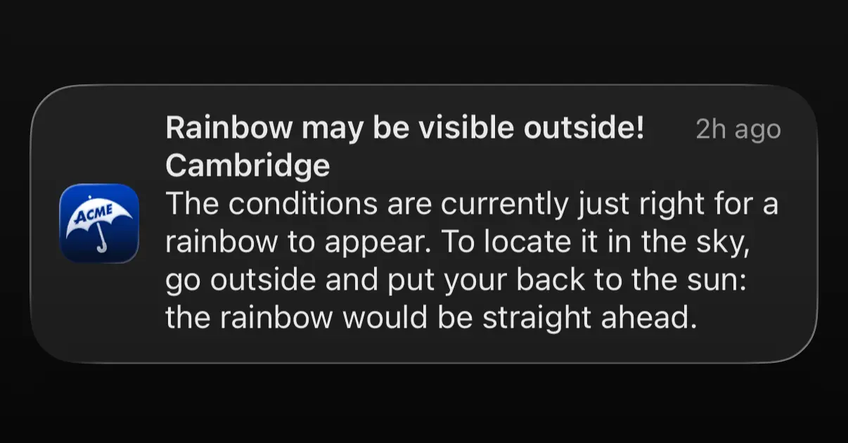 นอกจากเรื่องความแม่นยำที่เป็นจุดแข็งเดิม แอปยังพยายามเพิ่มความสนุกด้วยการแจ้งเตือนรุ้งกินน้ำหรือพระอาทิตย์ตกดินที่สวยงาม ซึ่งจะอยู่ในส่วนพิเศษที่เรียกว่า “Acme Labs” โดย Grossman กล่าวว่าพวกเขาจะระมัดระวังในการพยากรณ์สิ่งเหล่านี้เนื่องจากทำได้ยากมาก