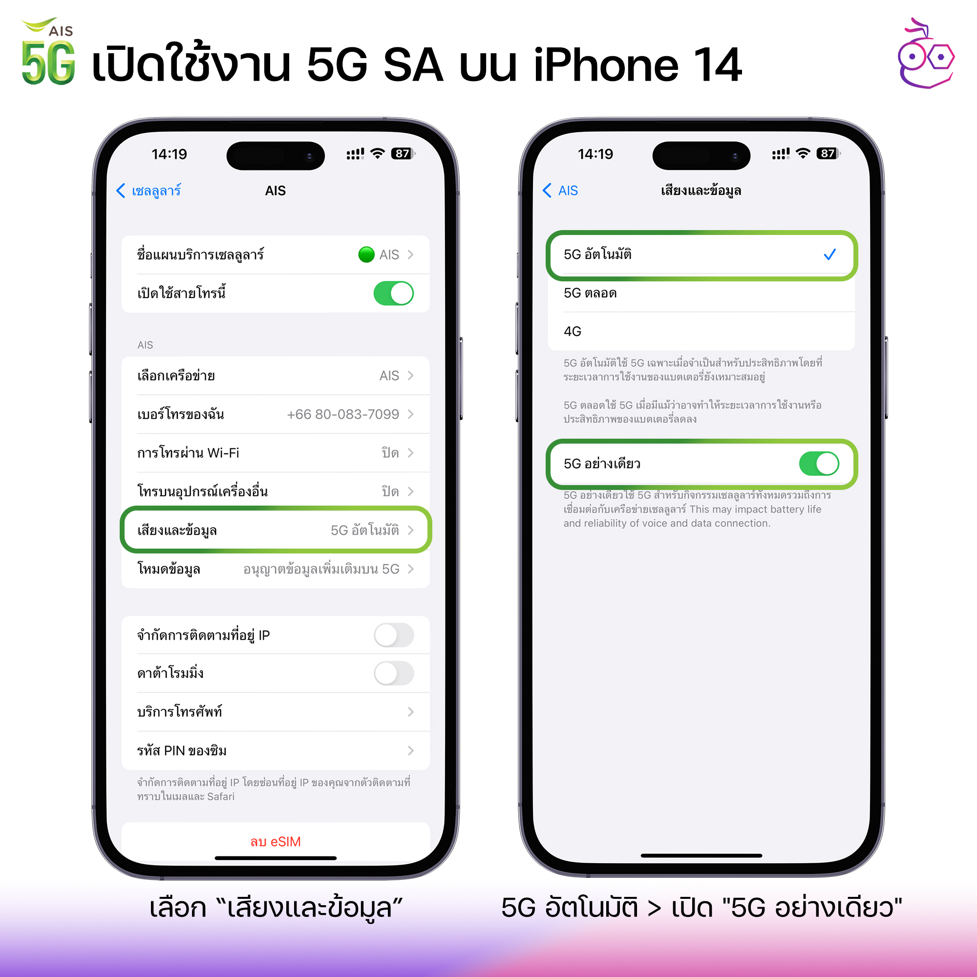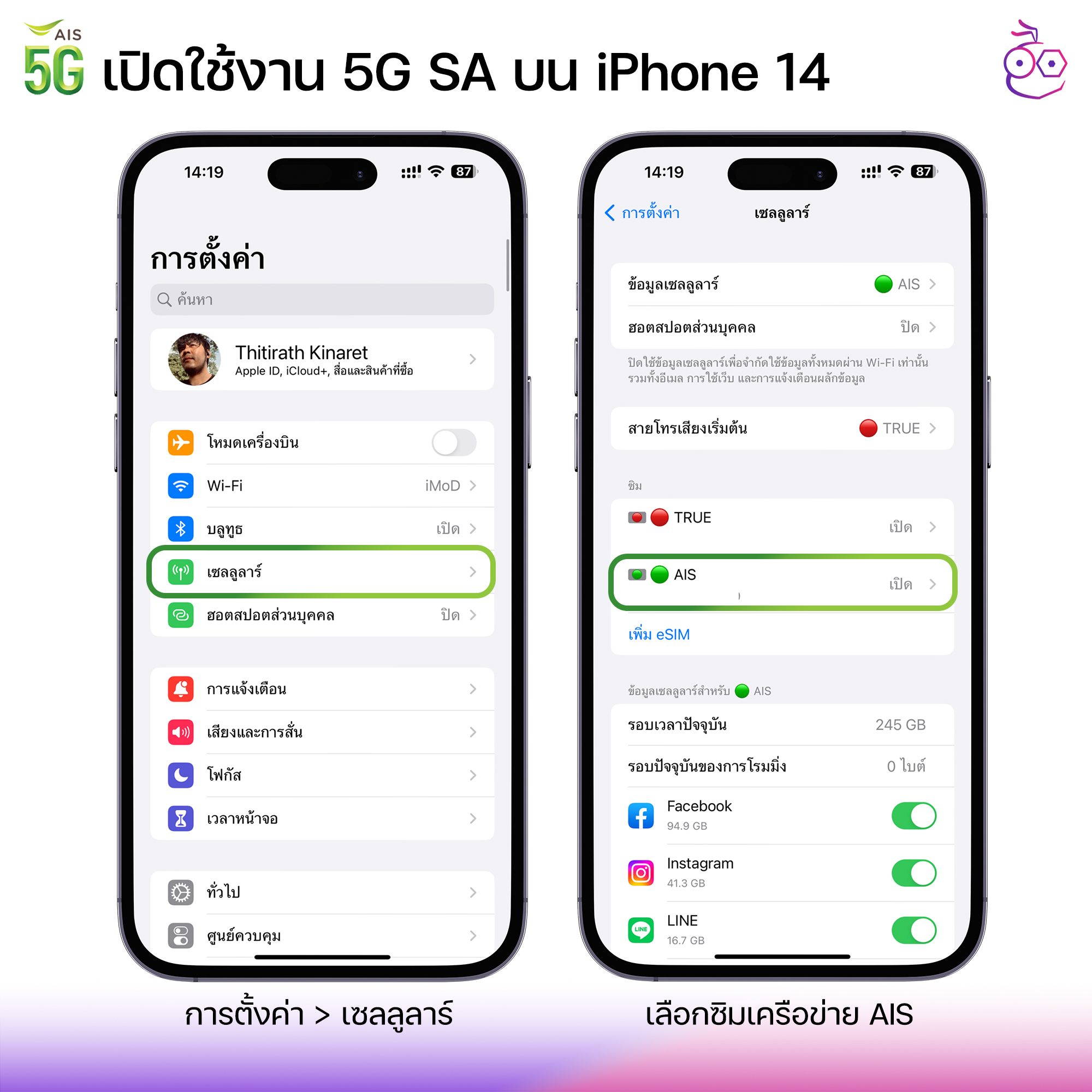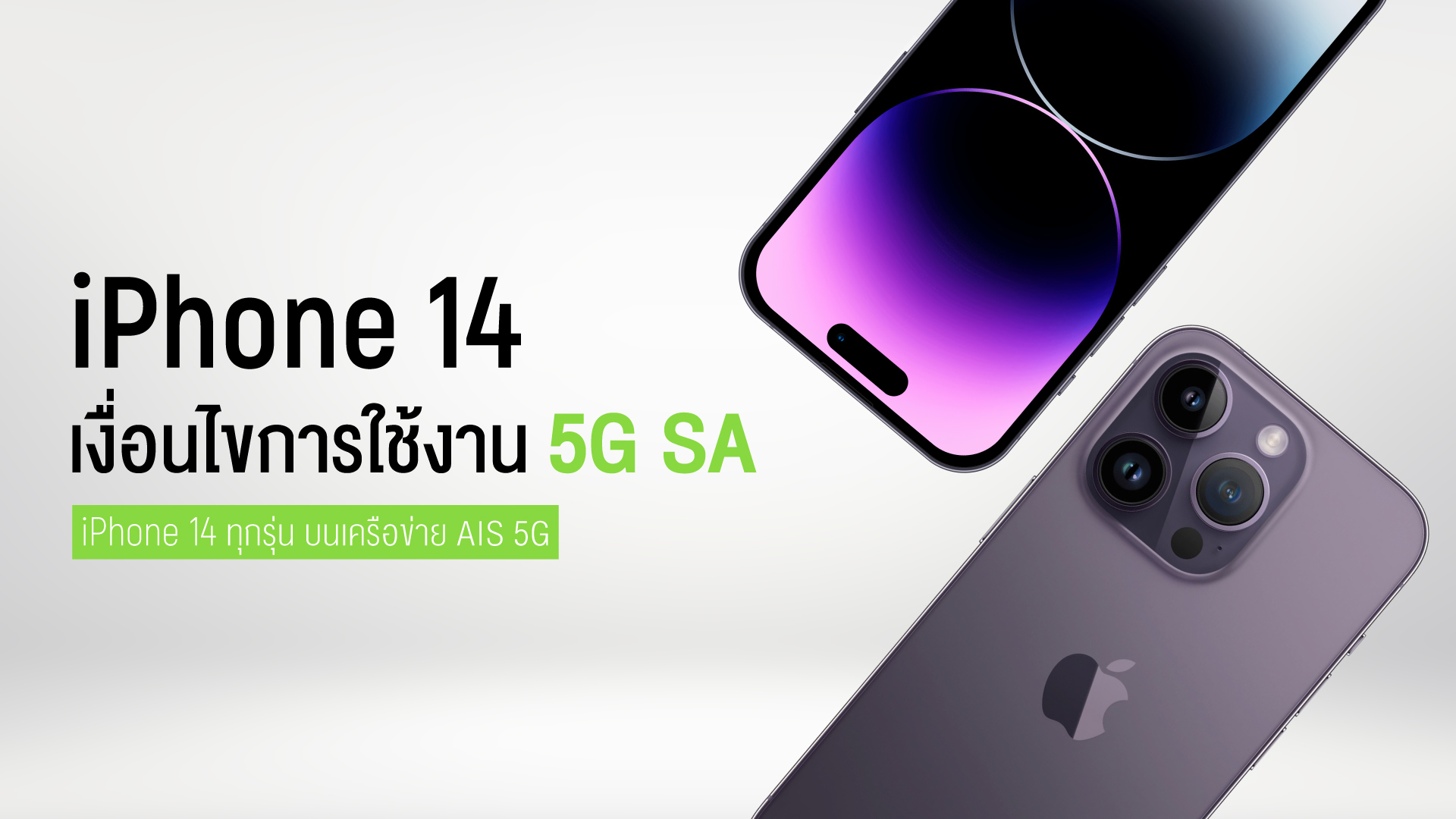 ดูรายละเอียดเพิ่มเติมเกี่ยวการเปิดใช้บริการ AIS 5G SA บน iPhone 14 ได้ที่ www.ais.th/5g/connectivity.html#connectivity_5gsa