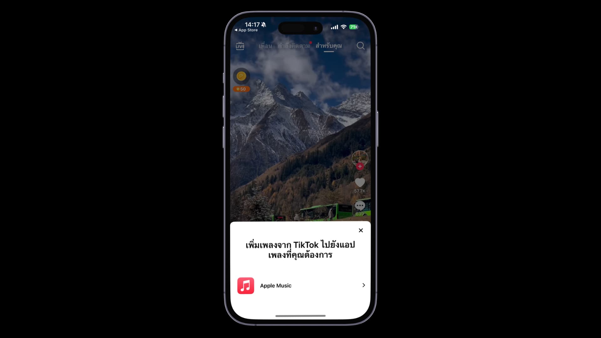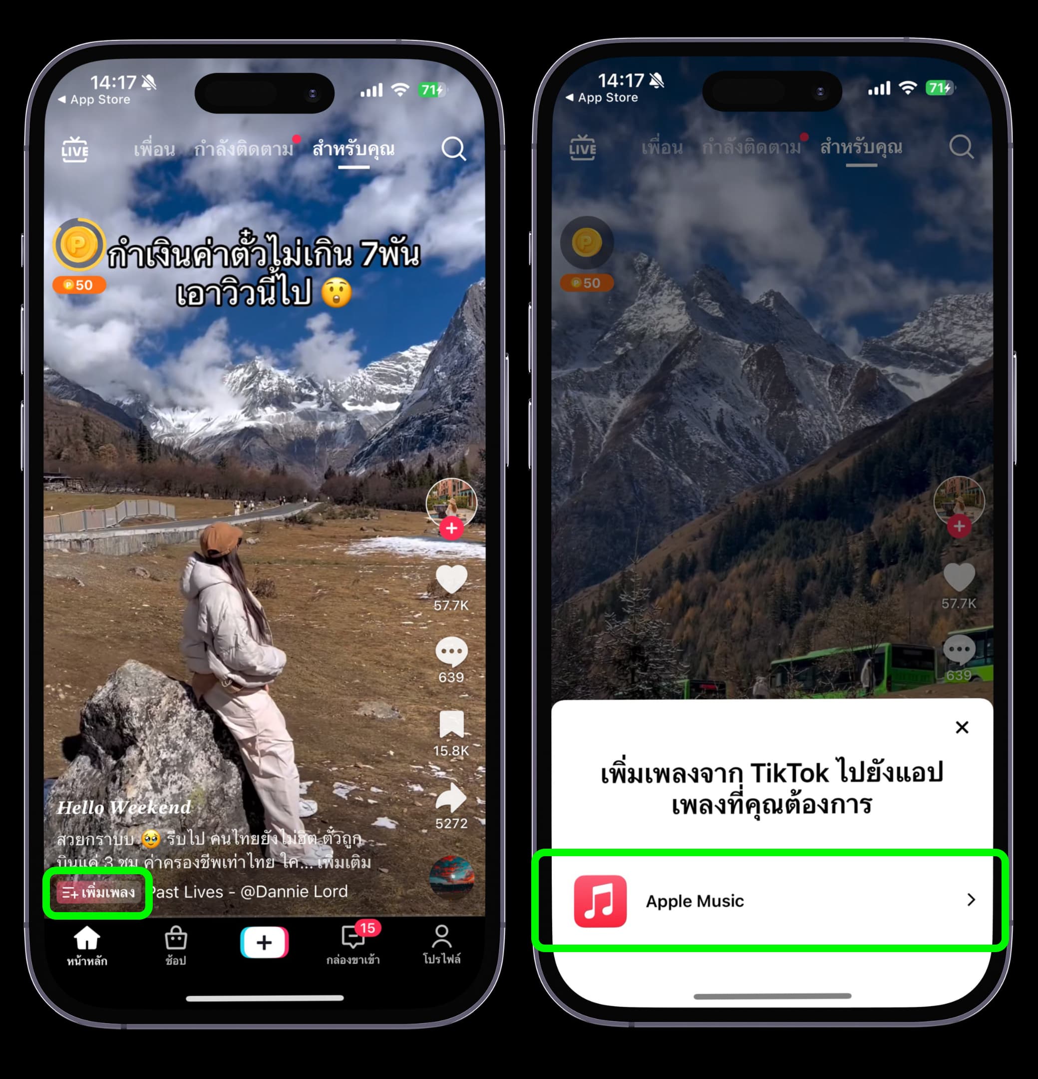 หากคลิปไหนมีเพลงอยู่เราจะสามารถแตะที่ปุ่ม “+เพิ่มเพลง” ที่อยู่มุมล่างซ้ายเพื่อทำการเพิ่มเพลงไปยังแอปที่เราใช้งานได้ หากมีแอป Apple Music ก็จะขึ้นตามรูปเลย