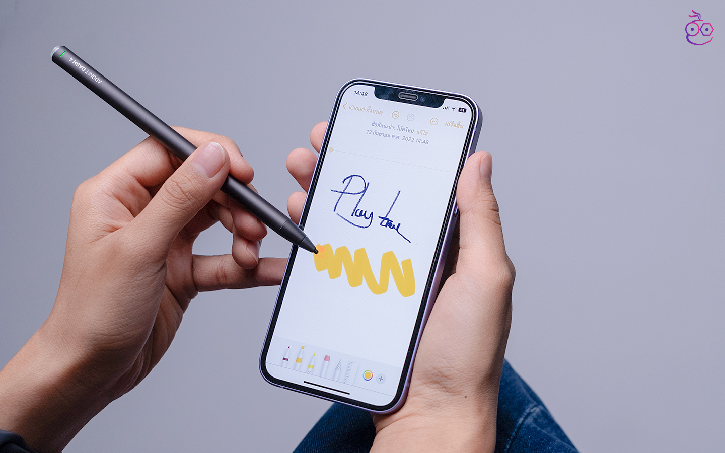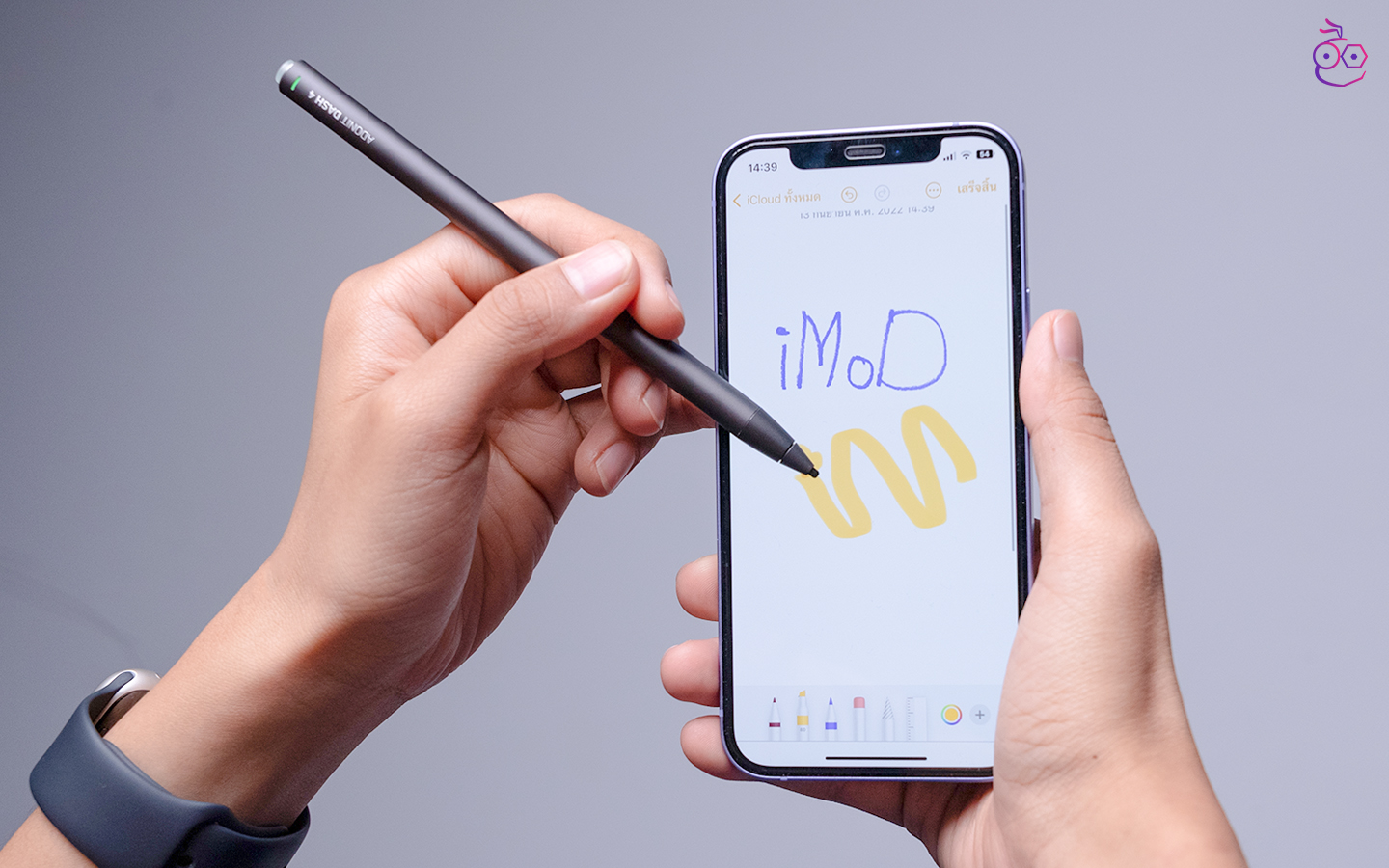 สำหรับการใช้งานบน iPhone ก็สามารถใช้ปากกาทัชสกรีนบนหน้าจอแทนนิ้วมือได้เลย รวมถึงการใช้งานแบบขีดเขียนบนหน้าจอก็ทำได้ลื่นไหลด้วย ซึ่งผู้เขียนได้ทดลองใช้งานในแอป Note บน iPhone ก็รู้สึกว่าสามารถใช้งานได้ลื่นไหล ขีดเขียนได้ไม่มีสะดุดเลย รวมถึงการลงน้ำหนักเส้นก็สามารถทำได้ปกติ แต่อาจจะไม่ค่อยคงที่เท่าที่ควร แต่อาจจะต้องระวังฝ่ามือโดนหน้าจอ เพราะโหมดนี้ไม่รองรับการตัดการรบกวนจากฝ่ามือนั่นเอง