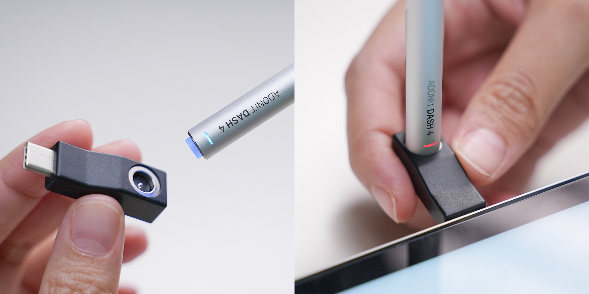 • ที่หัวปากกาเป็นตัวชาร์จแบบแม่เหล็ก มาพร้อมอะแดปเตอร์ชาร์จพอร์ต USB-C