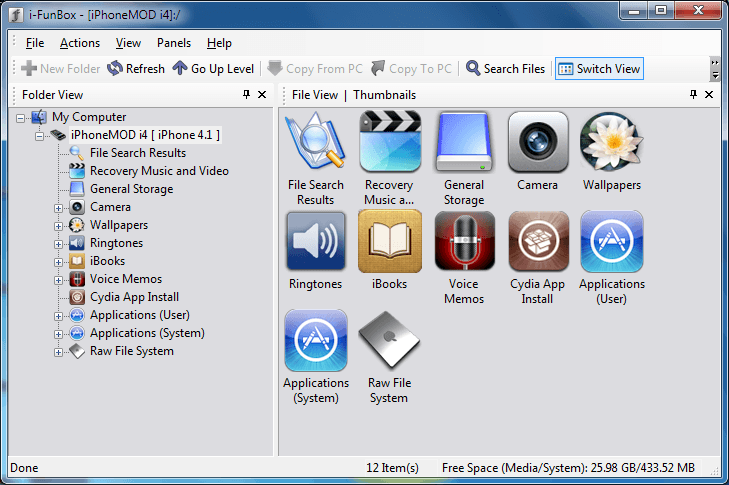 เลือก Install> Confirm ติดตั้งให้เรียบร้อย เครื่องจะให้รีบูตหลังจากนั้นลองเชื่อมต่อเข้ากับ i-Funbox ดูครับ เราจะเห็นว่ามีเมนูเพิ่มขึ้นมาอีกเยอะเลยแบบนี้