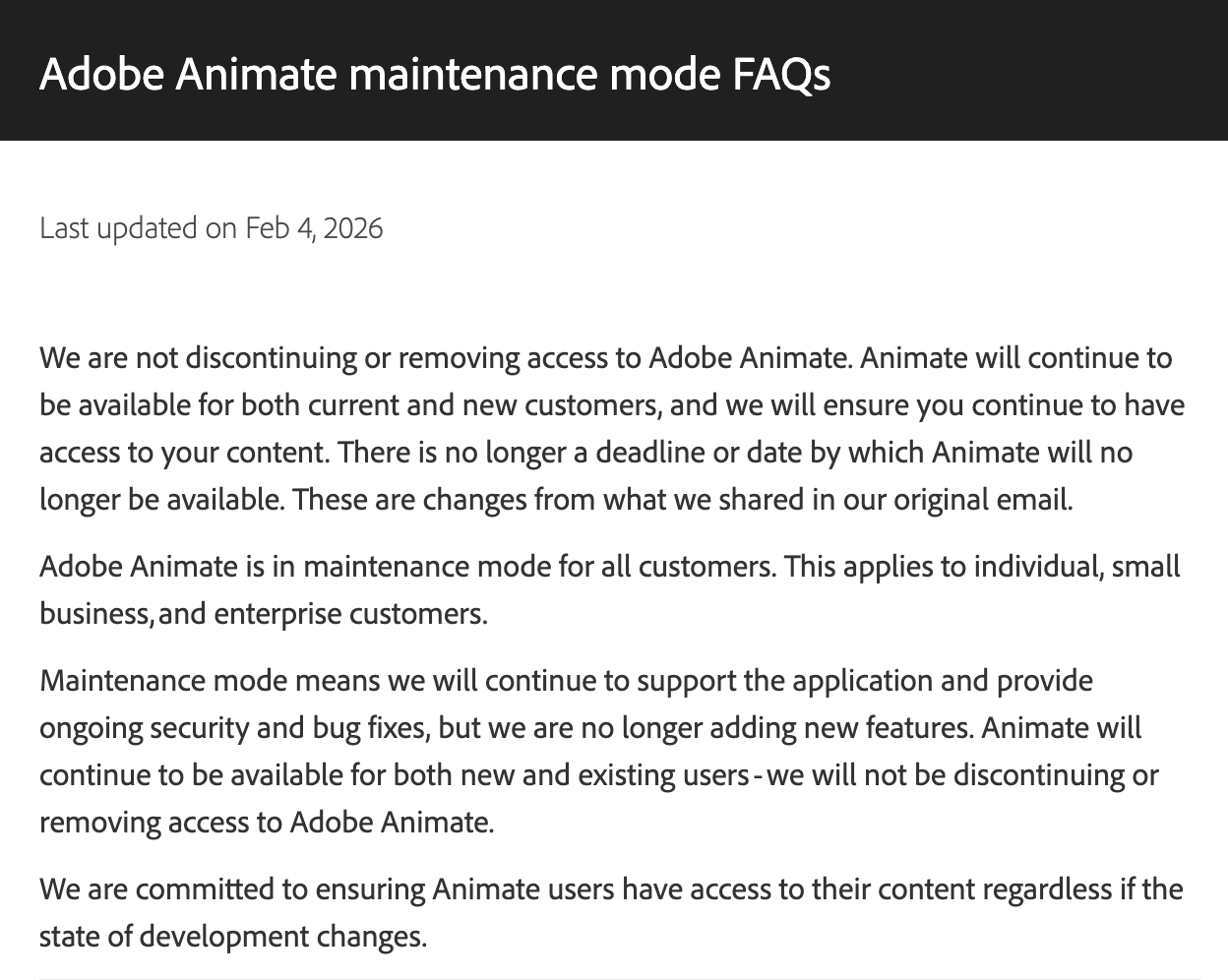 “Adobe Animate จะอยู่ใน Maintenance Mode (โหมดบำรุงรักษา) สำหรับลูกค้าทุกคน ทั้งลูกค้ารายบุคคล, ธุรกิจ และ องค์กร โดย Maintenance Mode คือเรายังคงสนับสนุนแอปพลิเคชันนี้ และยังคงมีการแก้ไขด้านความปลอดภัยและข้อบกพร่องอย่างต่อเนื่อง เพียงแต่เราจะไม่เพิ่มฟีเจอร์ในกับ Animate อีกต่อไป แต่แน่นอนว่าจะยังคงใช้งานได้ทั้งลูกค้าปัจจุบัน และลูกค้าใหม่ จะไม่มีการยุติ หรือยกเลิกการเข้าถึง” บริษัทยืนยัน