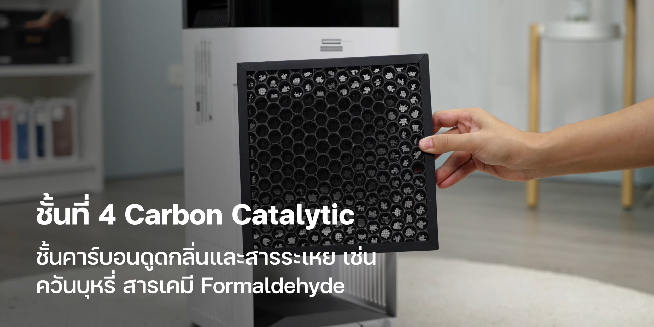- ชั้นที่ 4 กรองคาร์บอน (ถ่านกำมันต์) (Carbon Filter): ใช้ดูดซับกลิ่นต่าง ๆ สารเคมี สาระเหย เพื่อไม่ให้มีมลพิษในห้อง เช่น กลิ่นควันหรือบุหรี่ สารระเหยที่มาจากพลาสติกที่ไม่ได้คุณภาพ สารฟอร์มาดิไฮด์