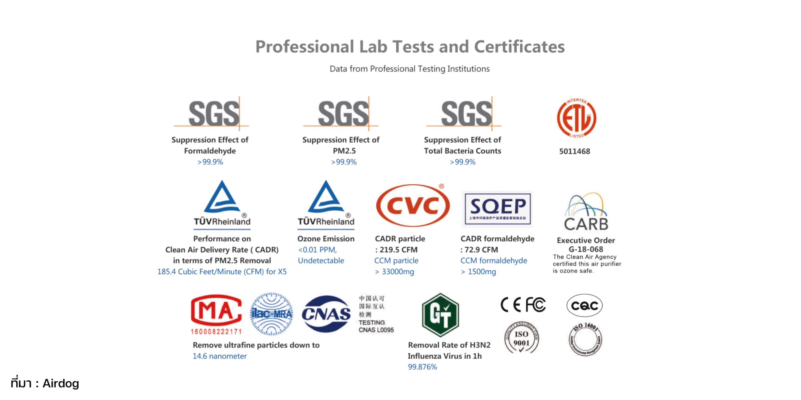 เครื่องฟอกอากาศ Airdog ได้รับมาตราฐาน ม.อ.ก. และมีการการผ่านวิจัยและมาตรฐานระดับโลกมากมาย มั่นใจปลอดภัย ใช้งานได้จริง คุ้มค่าสำหรับการใช้งานระยะยาว เพราะไม่ต้องเปลี่ยนฟิลเตอร์ ใช้ได้นาน 10 ปี เพียงถอดล้างทำความสะอาด