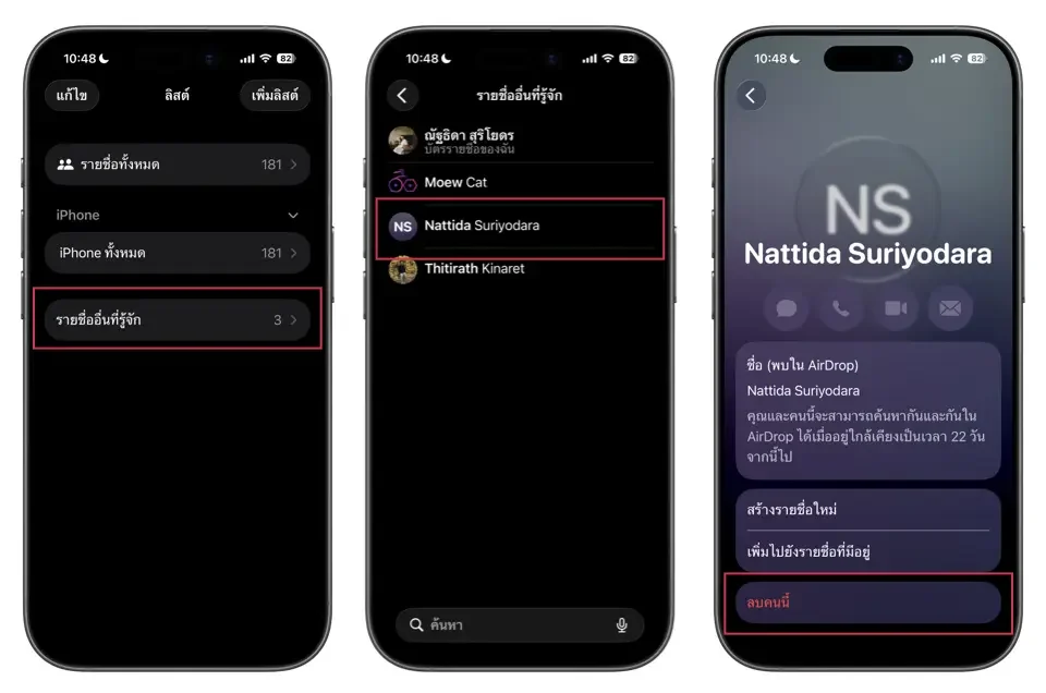 2. แอปรายชื่อ > รายชื่ออื่นที่รู้จัก > จากนั้นเลือกรายชื่อที่ต้องการลบ และกด “ลบคนนี้”
