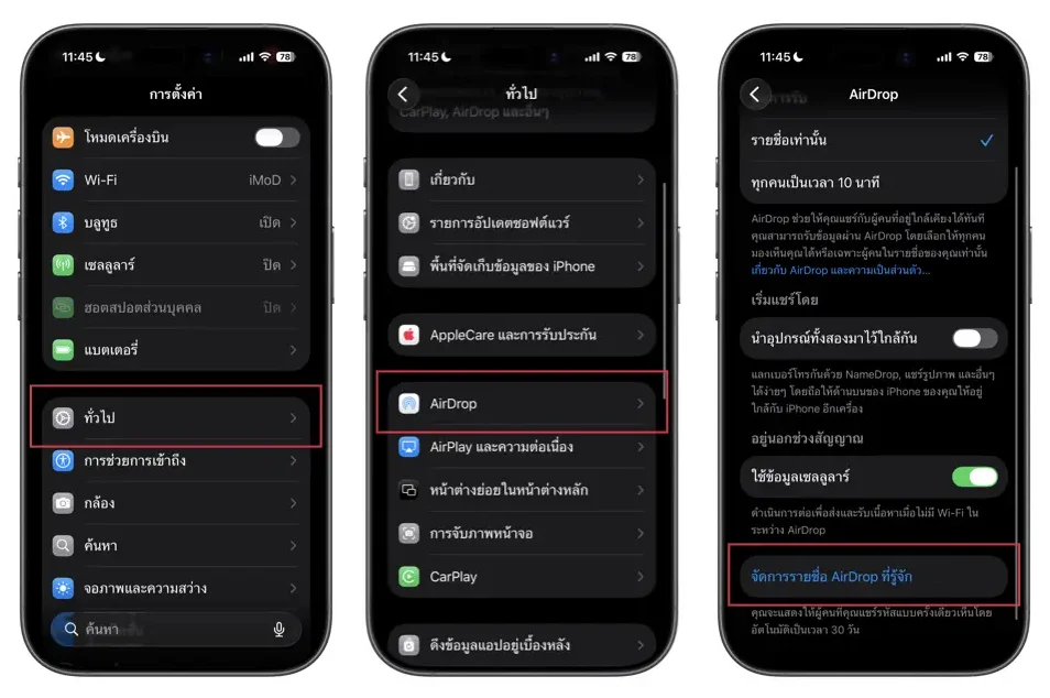 1. การตั้งค่า > ทั่วไป > AirDrop > จัดการรายชื่อ AirDrop ที่รู้จัก > แตะรายชื่อที่ต้องการลบ > กด “ลบคนนี้”