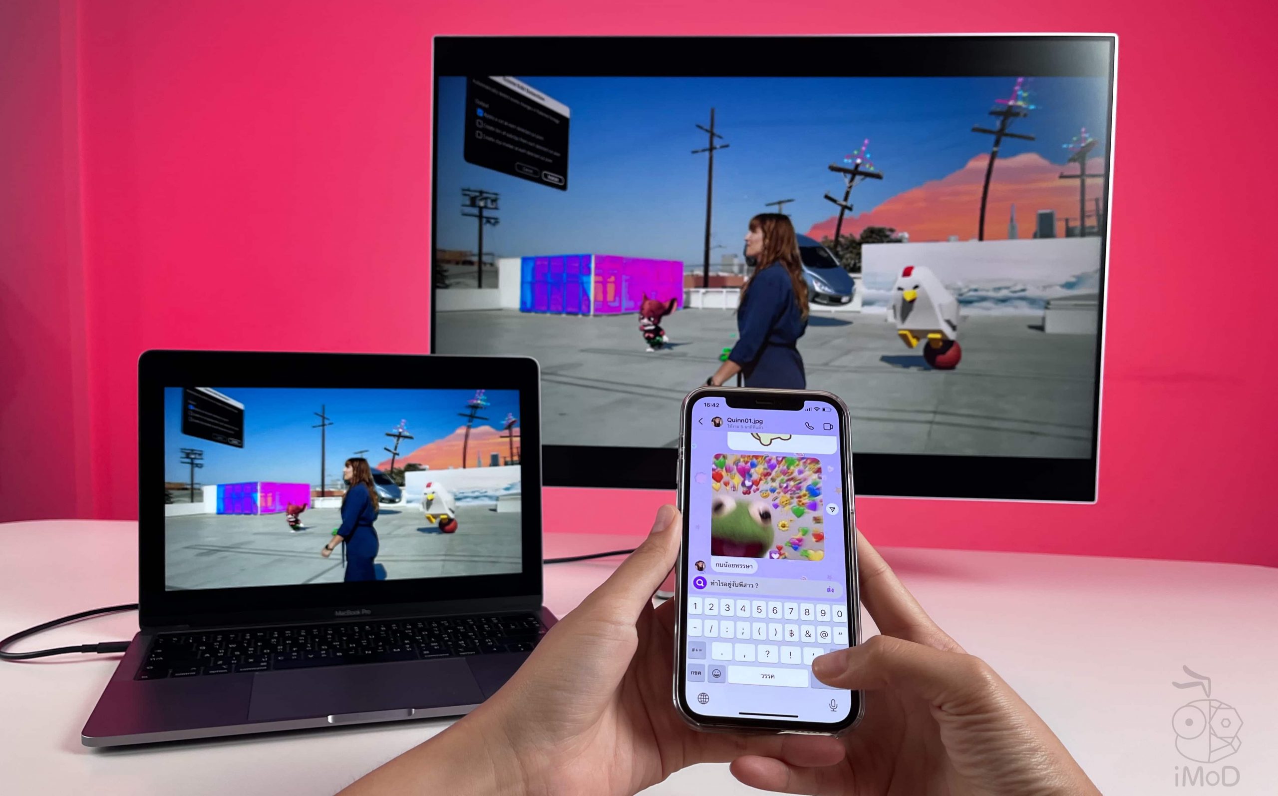 วิดีโอใน iPhone ก็จะแสดงไปยังเครื่อง Mac และถ้าเครื่อง Mac เชื่อมต่อกับจอภายนอกอยู่ ภาพสะท้อนหน้าจอจาก iPhone ก็จะไปแสดงที่หน้าจอนั้นด้วย
