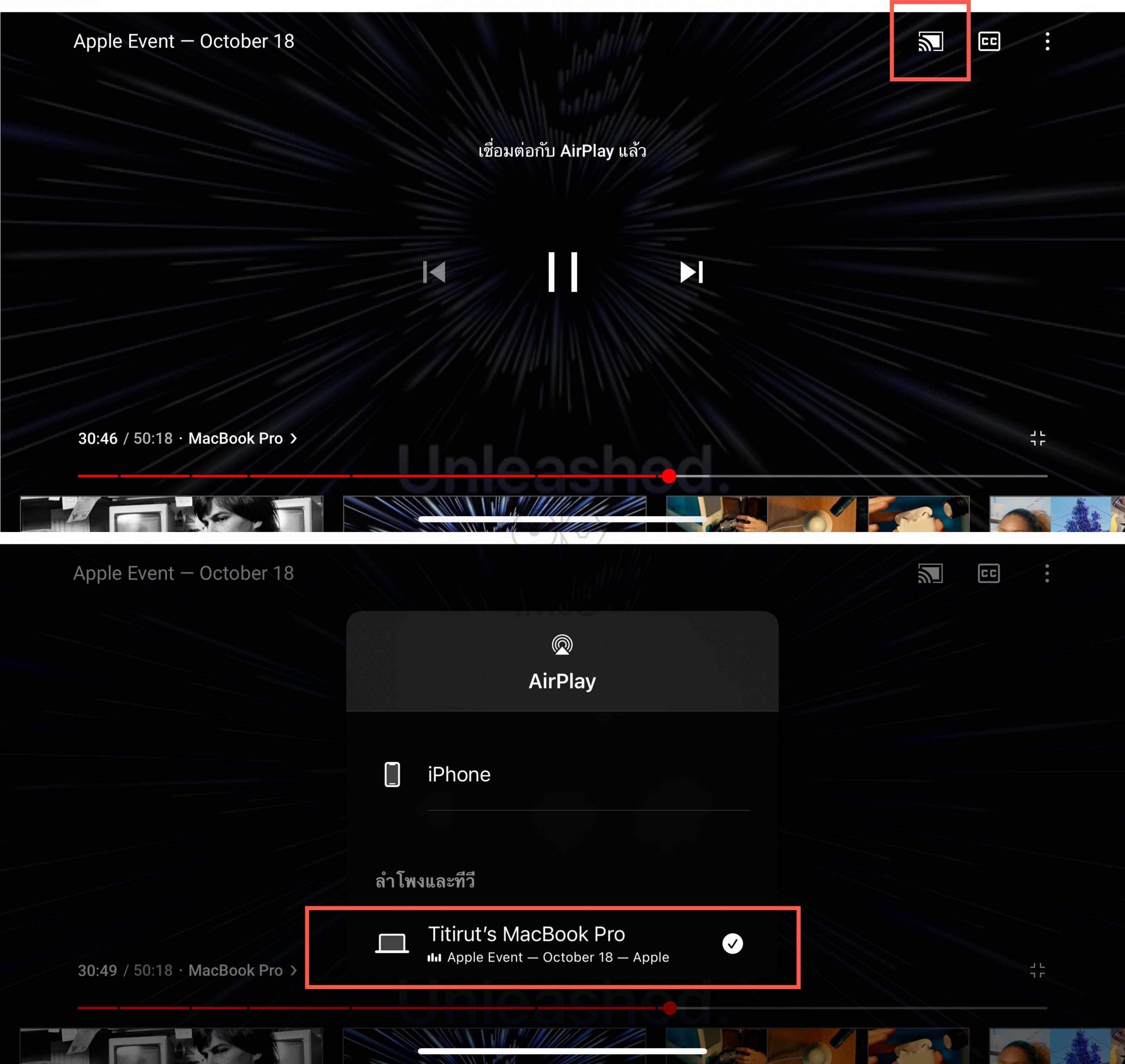 สำหรับ YouTube นั้นสามารถแตะไอคอน AirPlay ที่ตัววิดีโอได้เช่นกัน > เลือก Mac เครื่องปลายทางจะใช้แสดงวิดีโอ