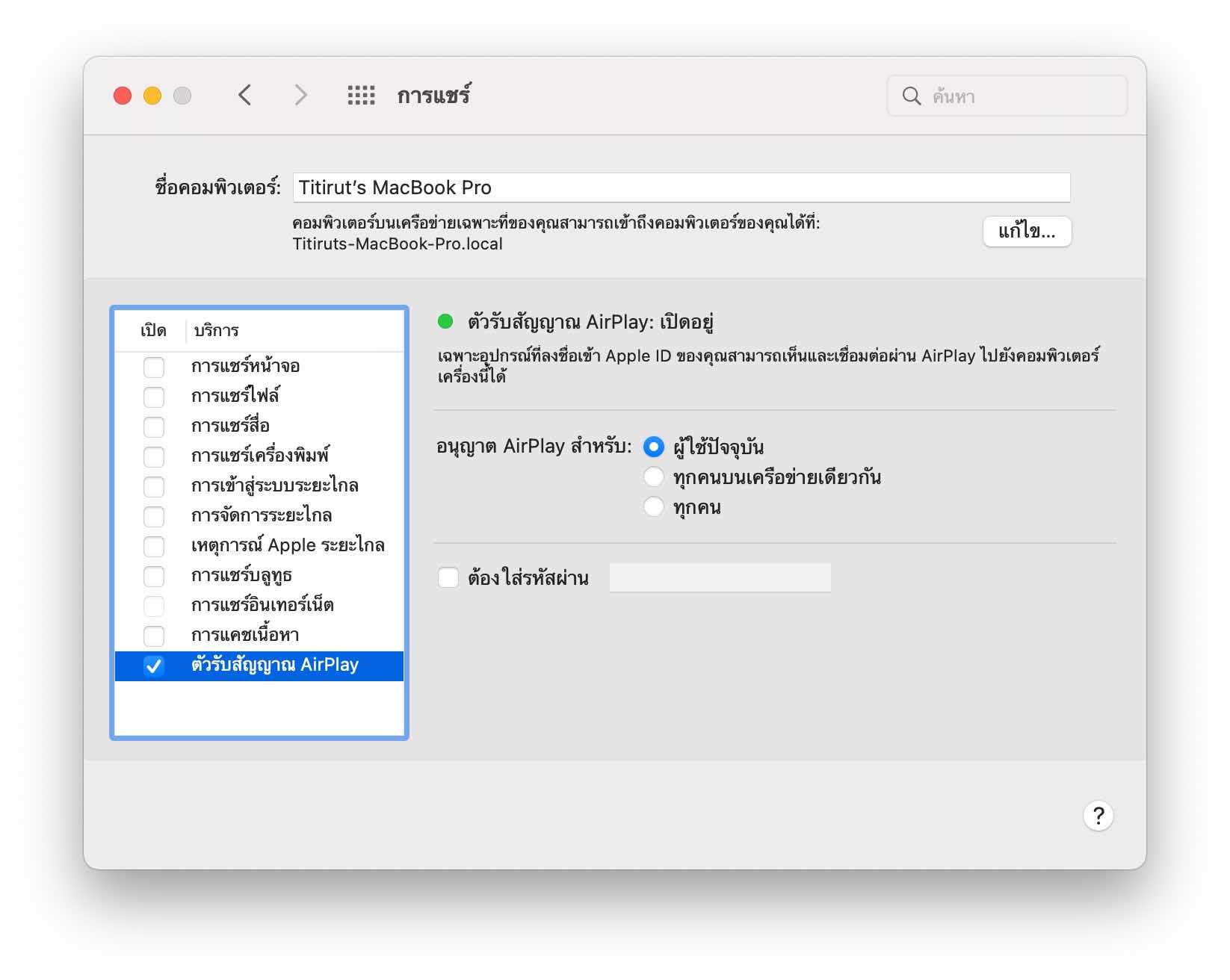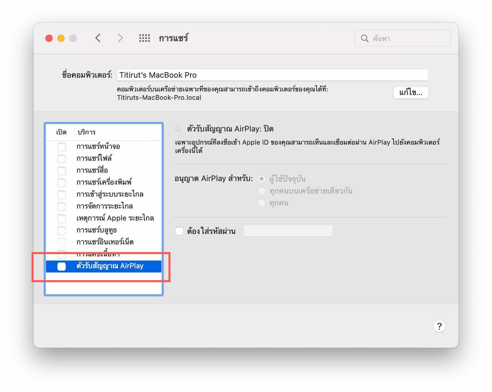 หากต้องการปิดการใช้งาน AirPlay to Mac ให้เข้าไปที่ การตั้งค่า > การแชร์ > คลิก ตัวรับสัญญาณ AirPlay ออก