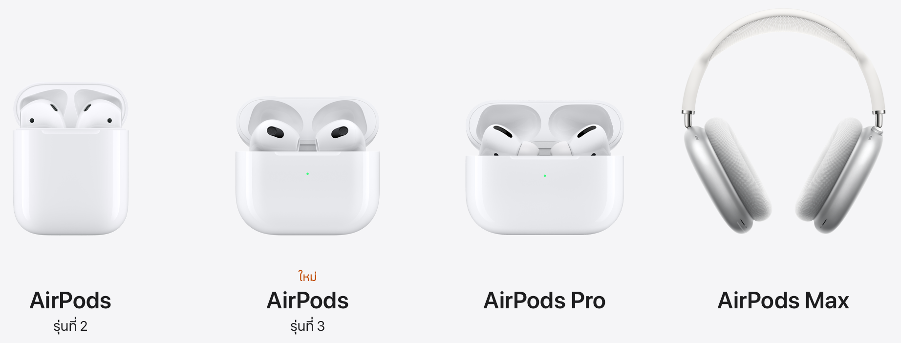 AirPods Max : รุ่นนี้เป็นหูฟังครอบหูตัวเดียวในซีรีส์ โดยออกแบบมาเหมาะสำหรับคนที่อยากให้หูฟัง AirPods ที่ใช้ฟังต่อเนื่องนาน ๆ โดยสเปกระบุว่าแบตใช้ได้นานถึง 20 ชม. ตัวหูฟังรองรับฟีเจอร์ Spatial Audio รองรับตัดเสียงรบกวน ANC และโหมดฟังเสียงภายนอกด้วย ใช้ฟังเพลงตอนทำงาน ชมภาพยนตร์ได้รับประสบการณ์ที่ดีอย่างแน่นอน