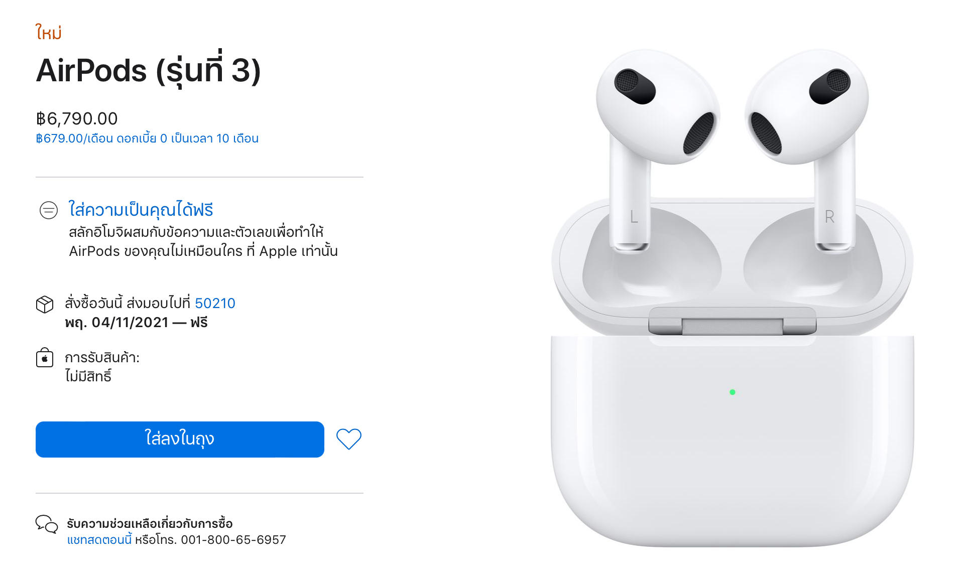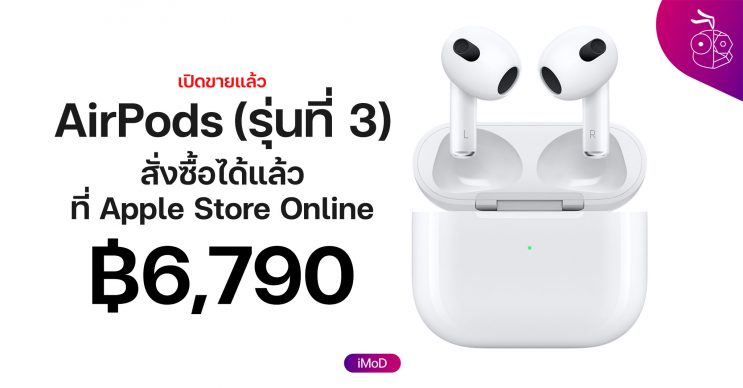 1 พ.ย. 64, Apple ได้เปิดให้สั่งซื้อ AirPods (รุ่นที่ 3) แล้วที่ Apple Store Online ราคา 6,790 บาท รับของเร็วสุดภายในสัปดาห์นี้