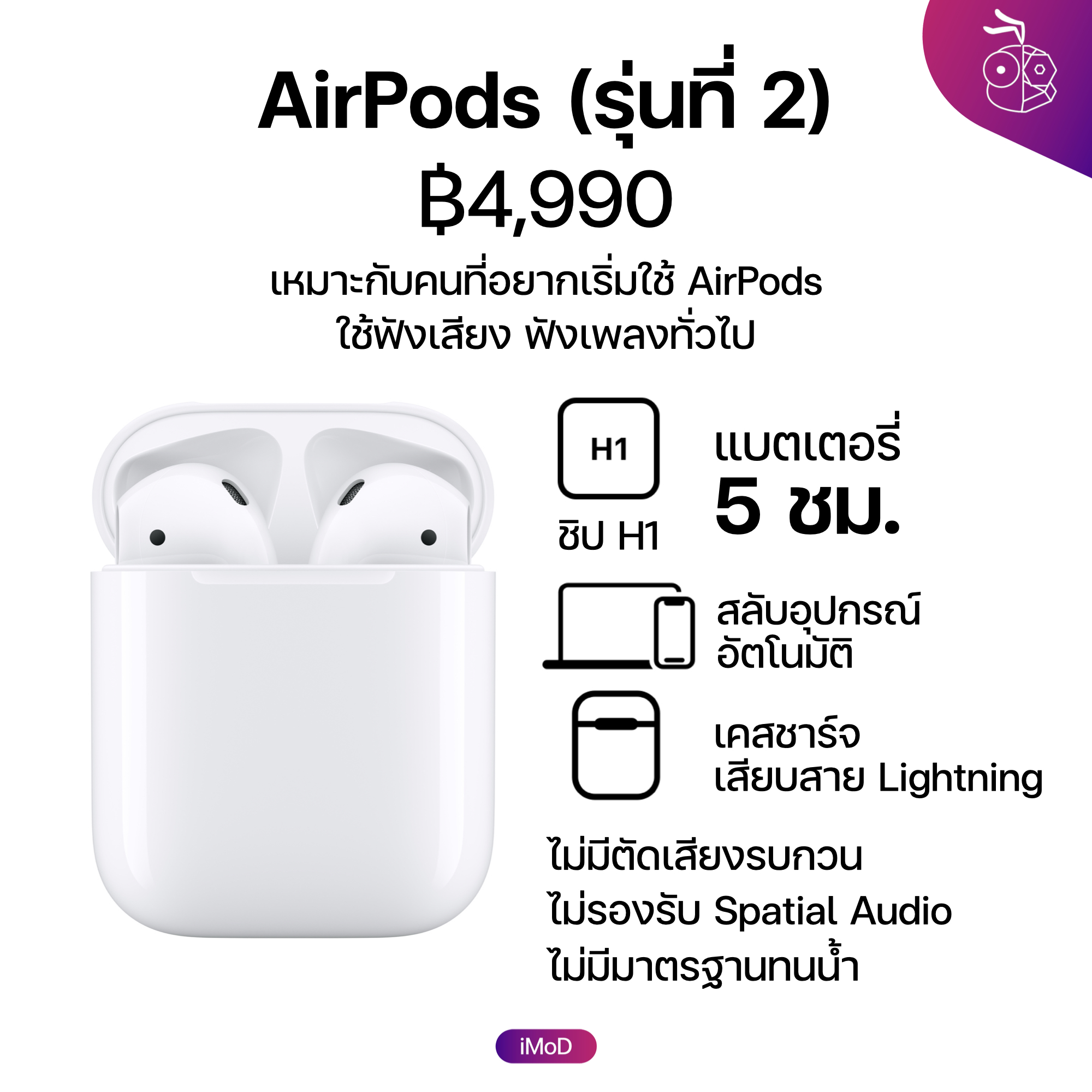 AirPods (รุ่นที่ 2) : รุ่นนี้เหมาะสำหรับผู้เริ่มต้นที่อยากเริ่มใช้หูฟัง AirPods เนื่องจากเป็นรุ่นที่ราคาถูกที่สุด เป็นหูฟังไร้สายที่เชื่อมต่อกับอุปกรณ์ Apple เช่น iPhone, iPad, Mac ได้อย่างรวดเร็ว สลับอุปกรณ์ได้ ใช้การแตะเพื่อสั่งการ แต่ไม่มีมาตรฐานทนน้ำจึงเหมาะสำหรับการใช้งานทั่วไป และไม่มีฟีเจอร์ตัดเสียงรบกวน รวมถึง Spatial Audio เหมือนรุ่นที่ 3, AirPods Pro จึงอาจมอบประสบการณ์การฟังเพลง มีเดีย ไม่ดีเท่ารุ่นที่แพงกว่า