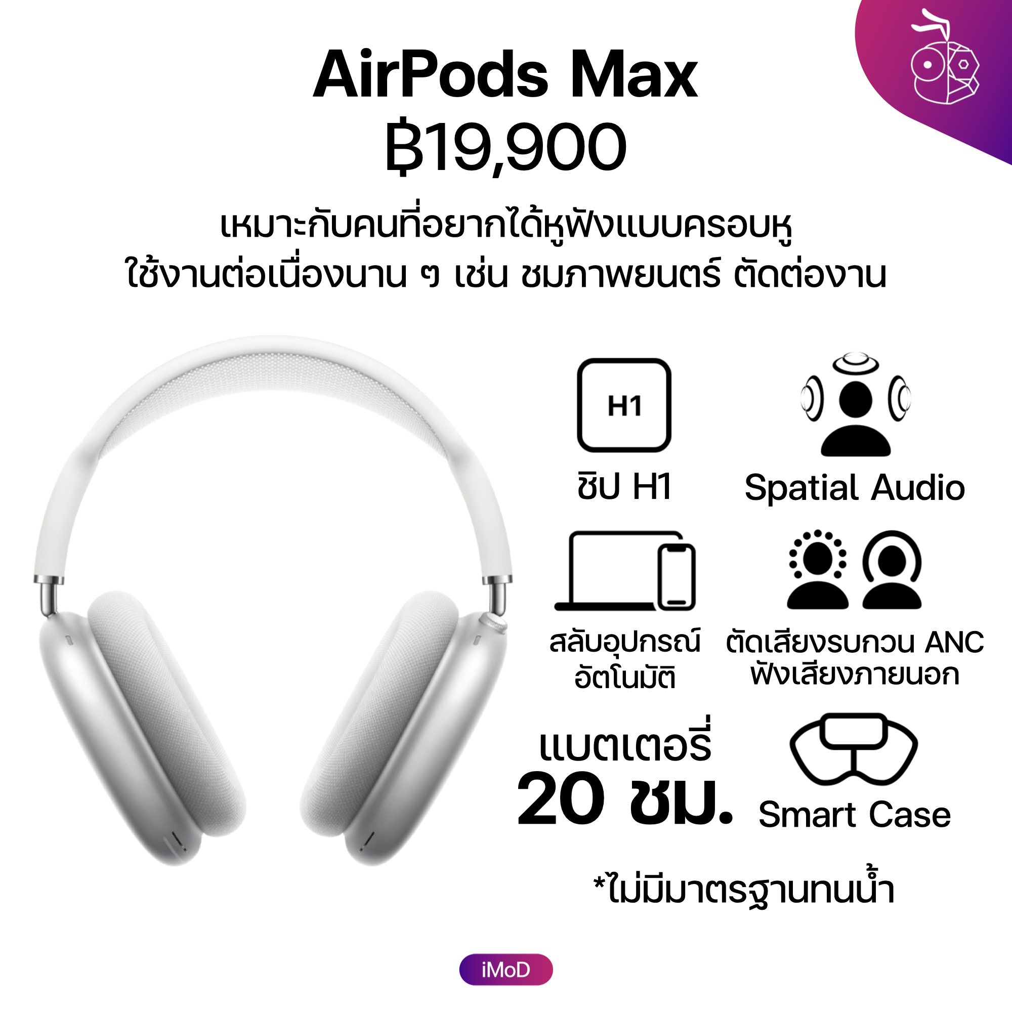 AirPods Max : รุ่นนี้เป็นหูฟังครอบหูตัวเดียวในซีรีส์ โดยออกแบบมาเหมาะสำหรับคนที่อยากให้หูฟัง AirPods ที่ใช้ฟังต่อเนื่องนาน ๆ โดยสเปกระบุว่าแบตใช้ได้นานถึง 20 ชม. ตัวหูฟังรองรับฟีเจอร์ Spatial Audio รองรับตัดเสียงรบกวน ANC และโหมดฟังเสียงภายนอกด้วย ใช้ฟังเพลงตอนทำงาน ชมภาพยนตร์ได้รับประสบการณ์ที่ดีอย่างแน่นอน