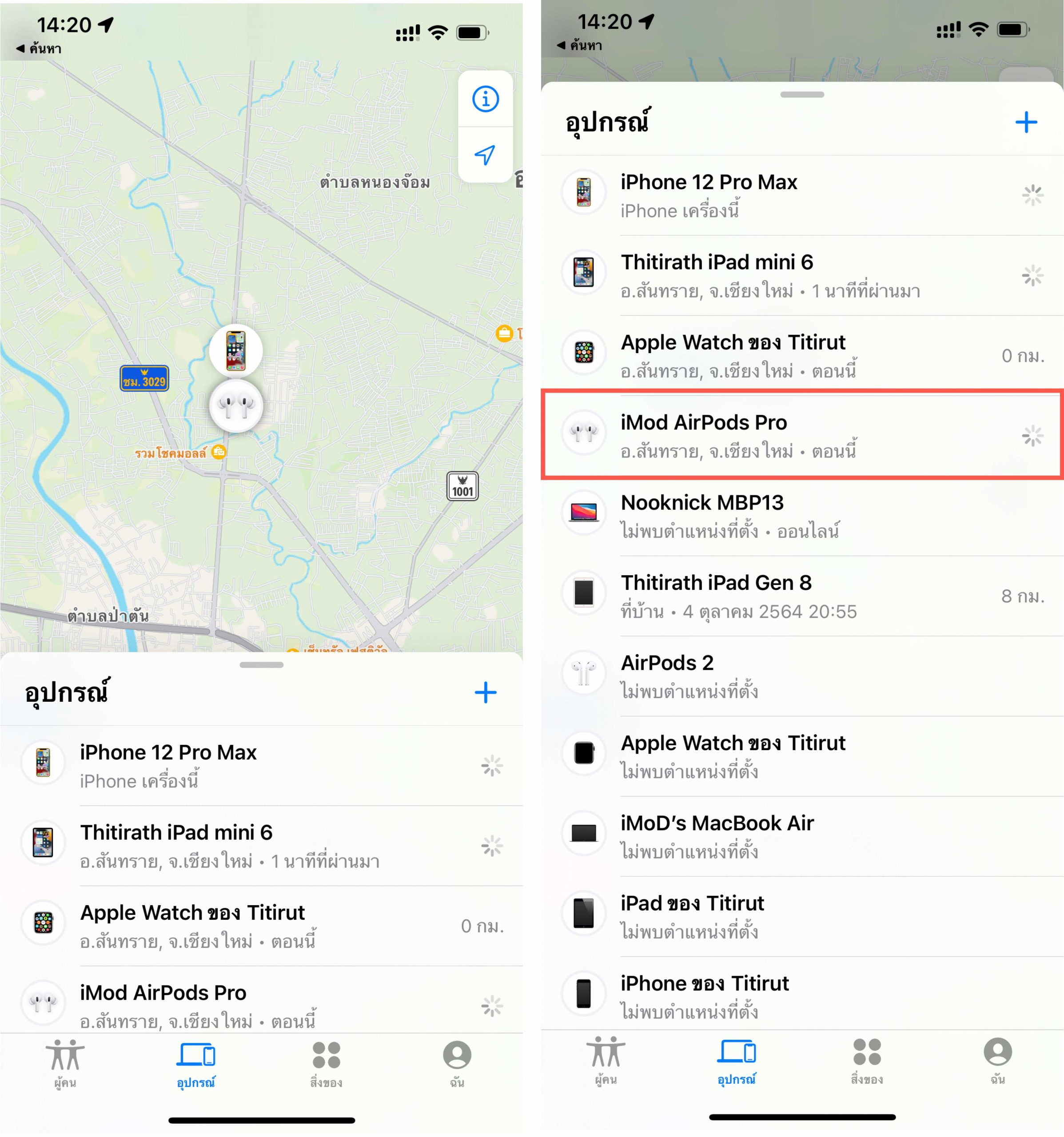 การค้นหา AirPods Pro, AirPods Max ทำได้โดย เปิดแอป Find My (ค้นหาของฉัน) > แตะ AirPods Pro หรือ AirPods Max ที่ต้องการค้นหา
