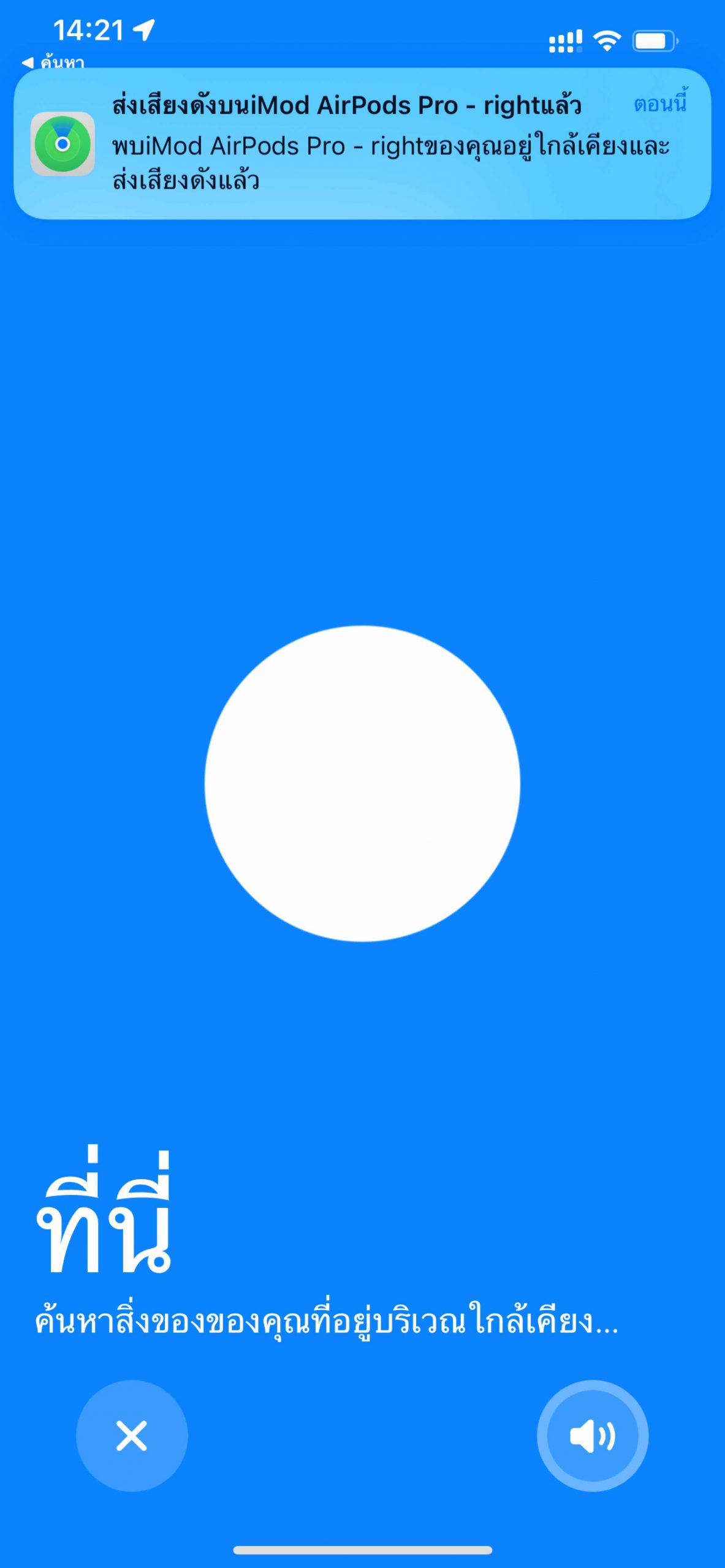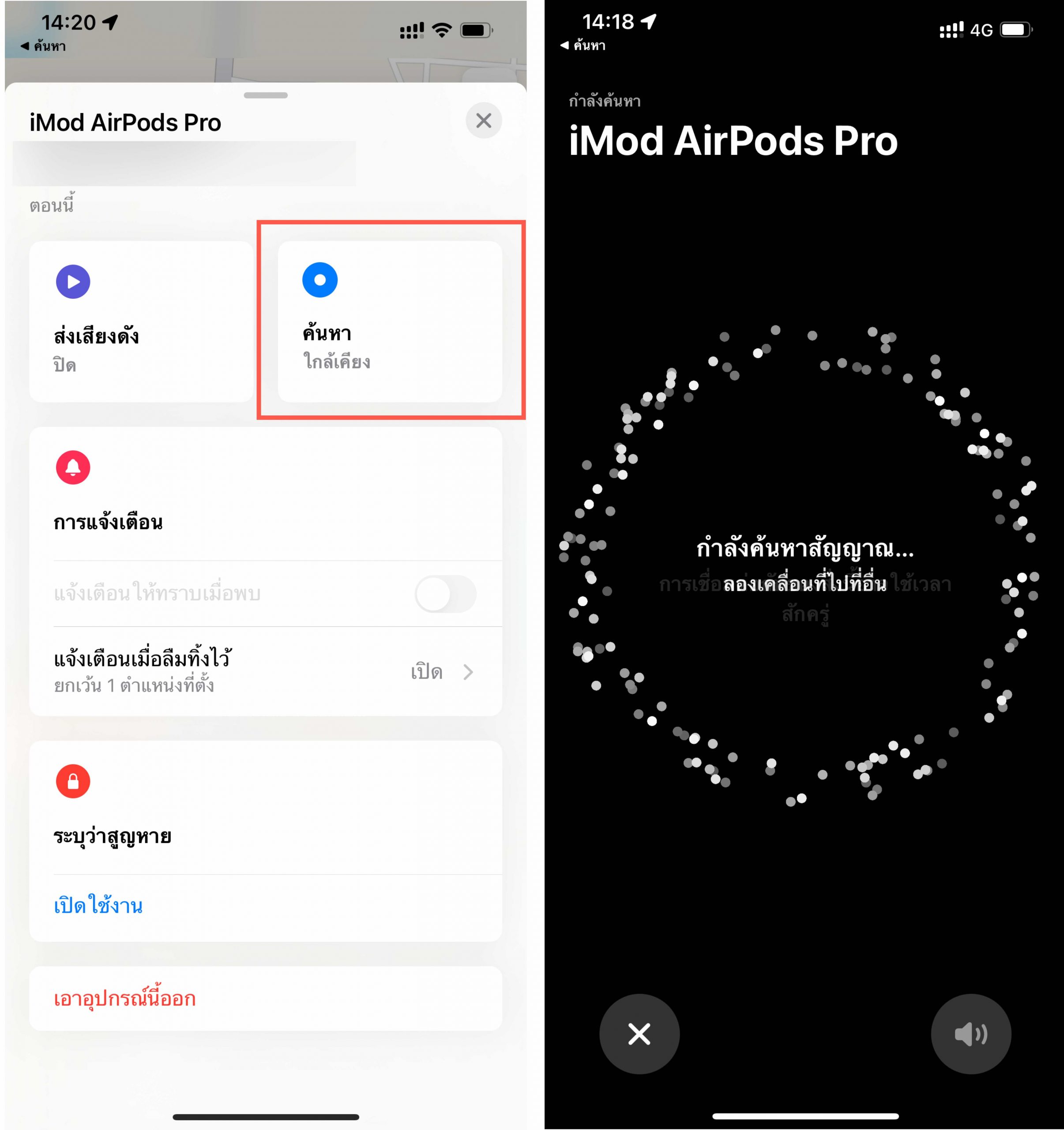 จากนั้นเลือกได้ว่าจะให้ตัว AirPods ส่งเสียง, เปิดใช้ฟีเจอร์ “ค้นหาใกล้เคียง” หรือแตะเพื่อ “ระบุว่าสูญหาย” ก็ได้ ตัวอย่างเช่น หากเราแตะเลือก “ค้นหาใกล้เคียง” ก็สามารถเดินหาอุปกรณ์ ในพื้นที่ได้เลย (เหมือนการค้นหา AirTags)